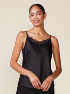 This satin cami features a silky, smooth finish with delicate lace at the neckline and three button details. Statement accessories with heels will dress up your look while denim and sandals offer a casual vibe. The versatility of this top makes it wardrobe essential.