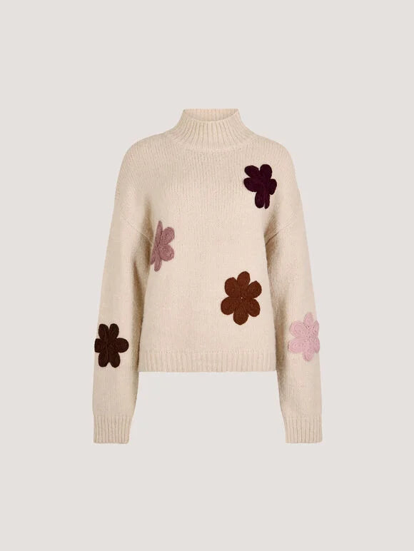 Apricot Floral Embroidered Mock Neck Sweater- Stone