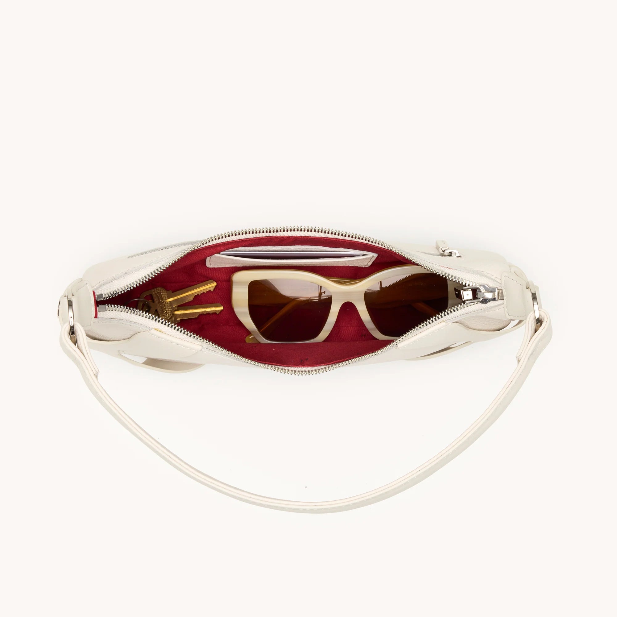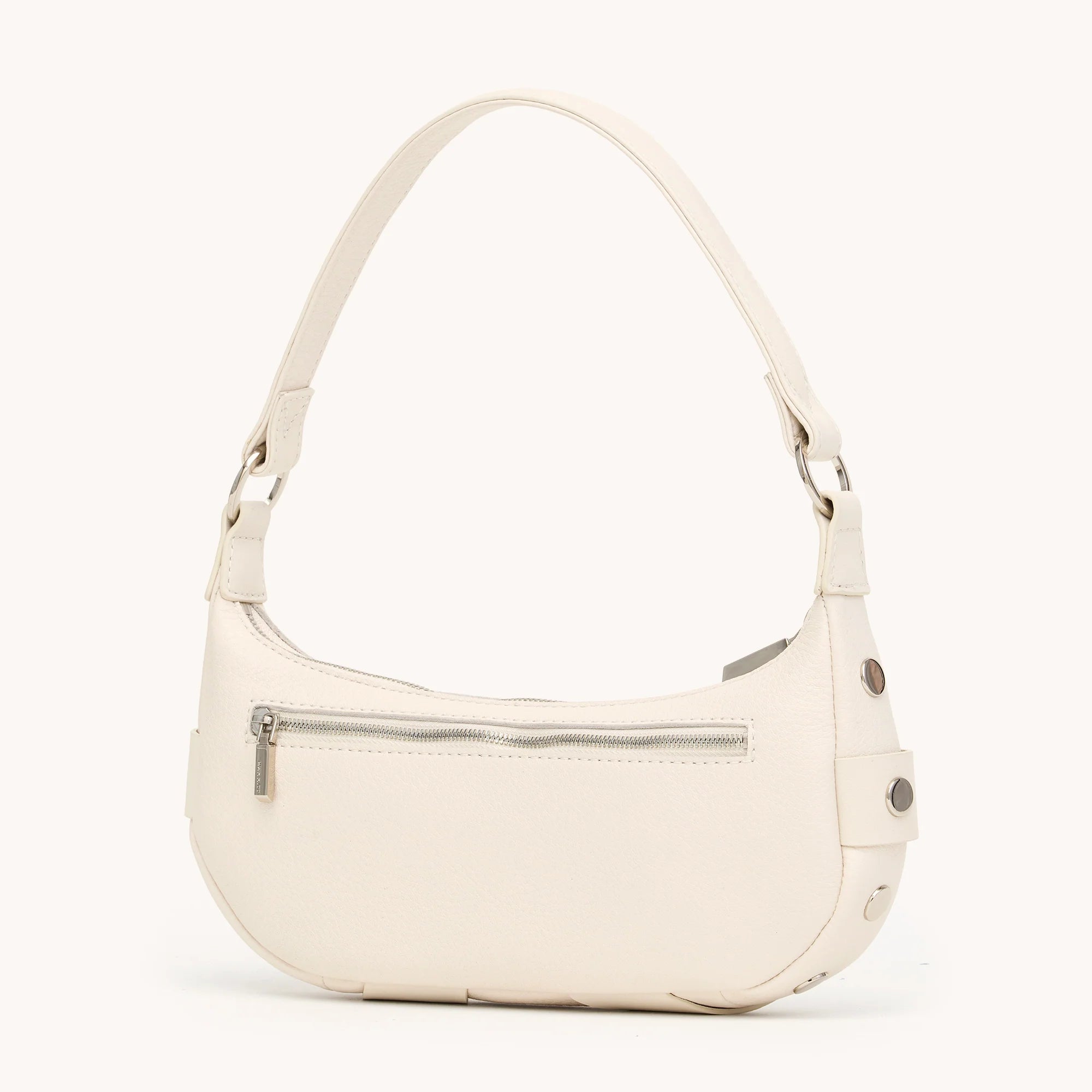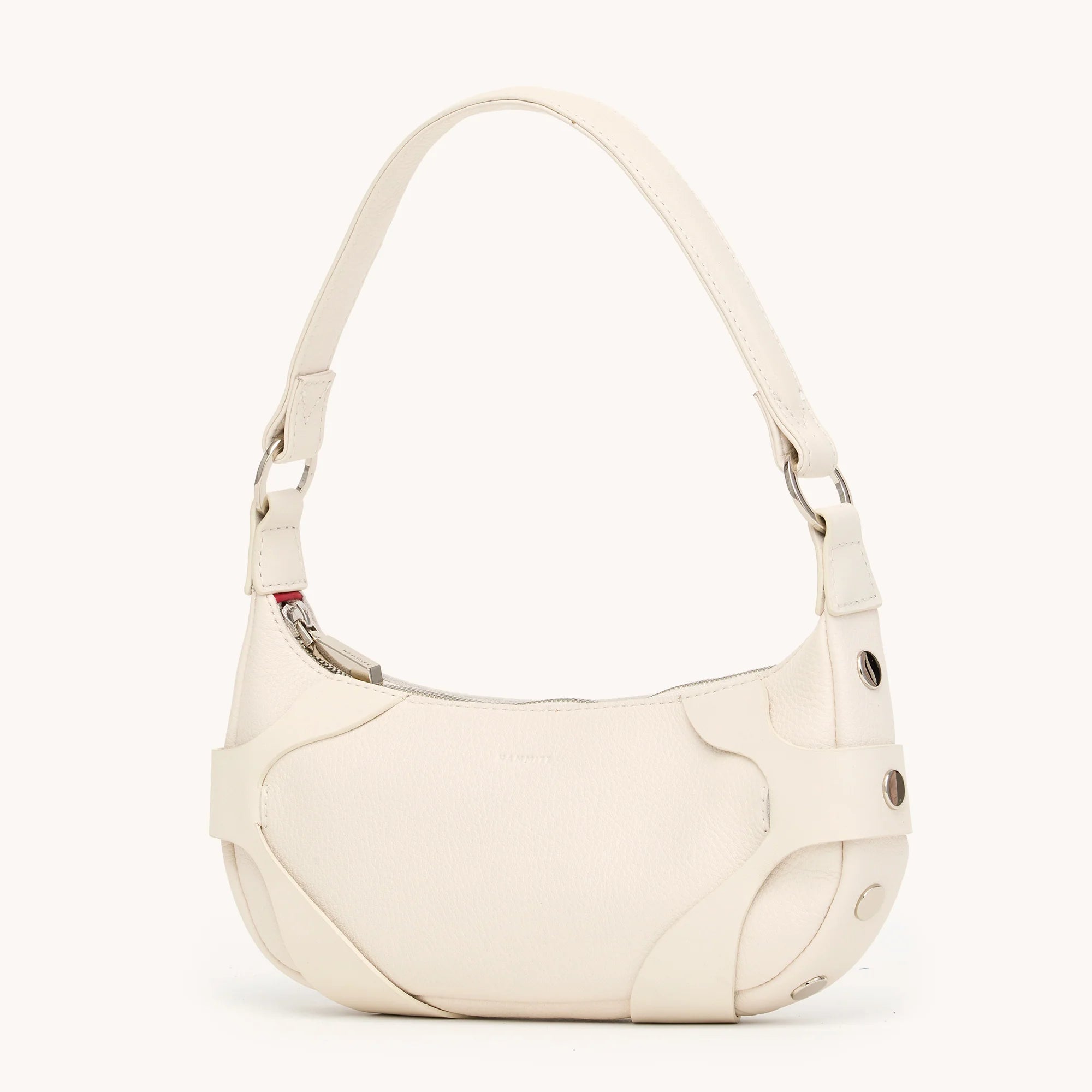 • Crafted with a bright, warm white pebble leather and a smooth, semi-veg tanned winter white leather panel caging treatment