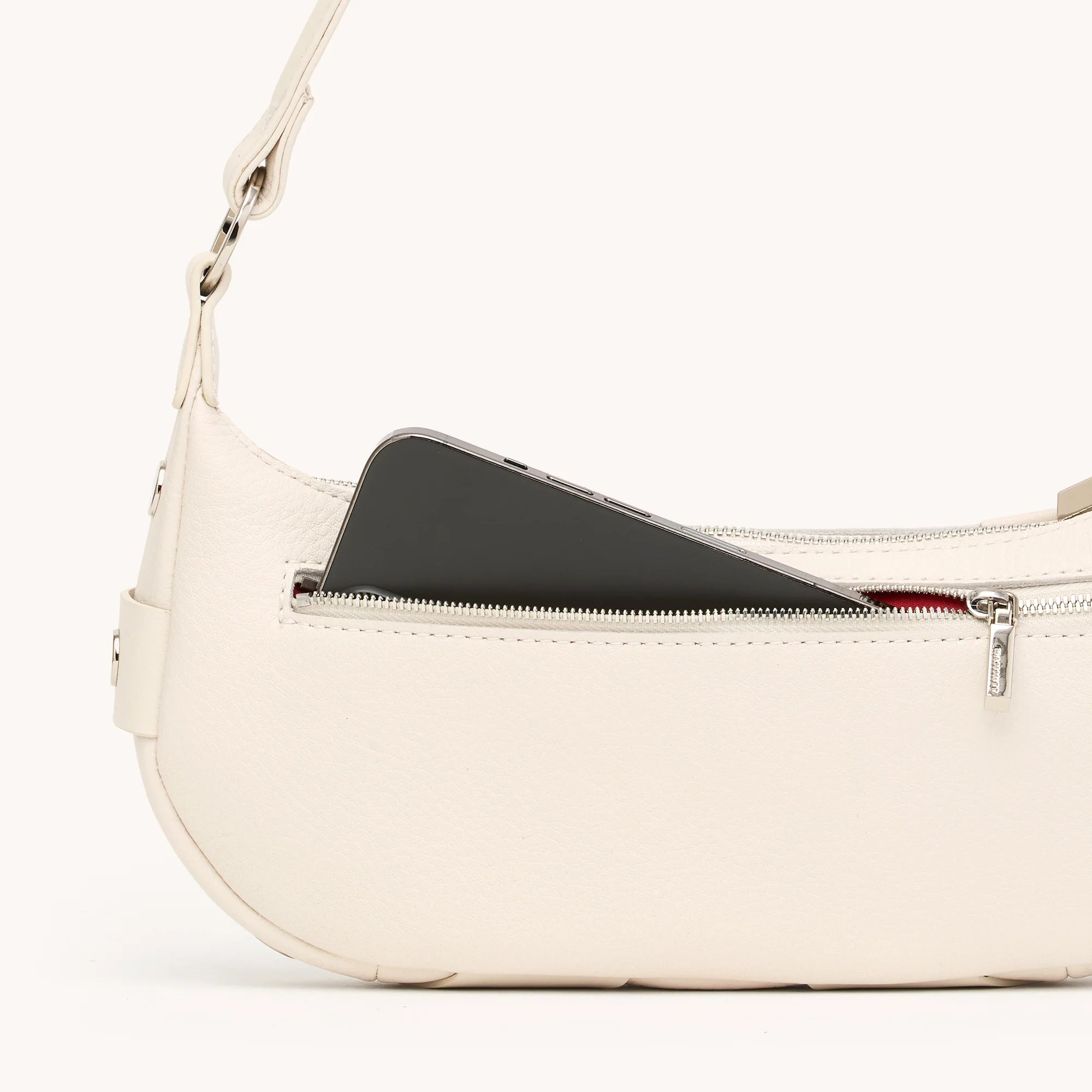 - Crafted with a bright, warm white pebble leather and a smooth, semi-veg tanned winter white leather panel caging treatment