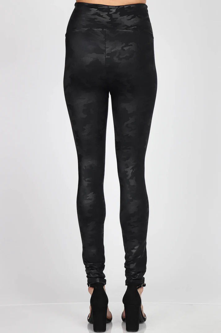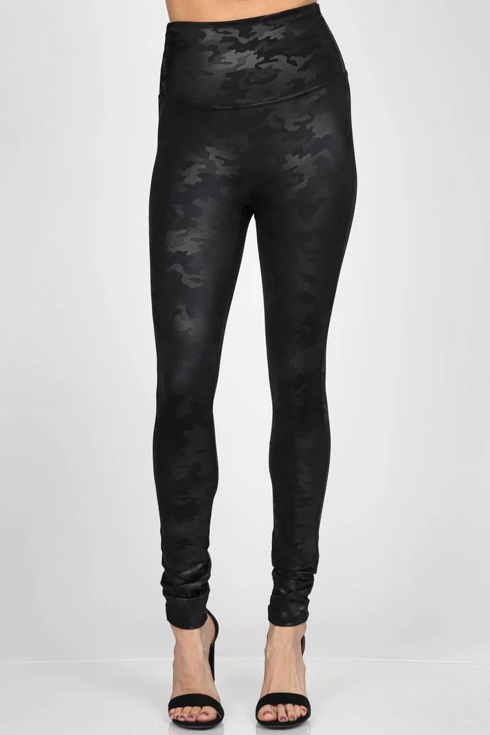 Features their iconic six inch tummy-control waistband and a leather-like sheen.