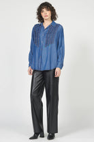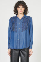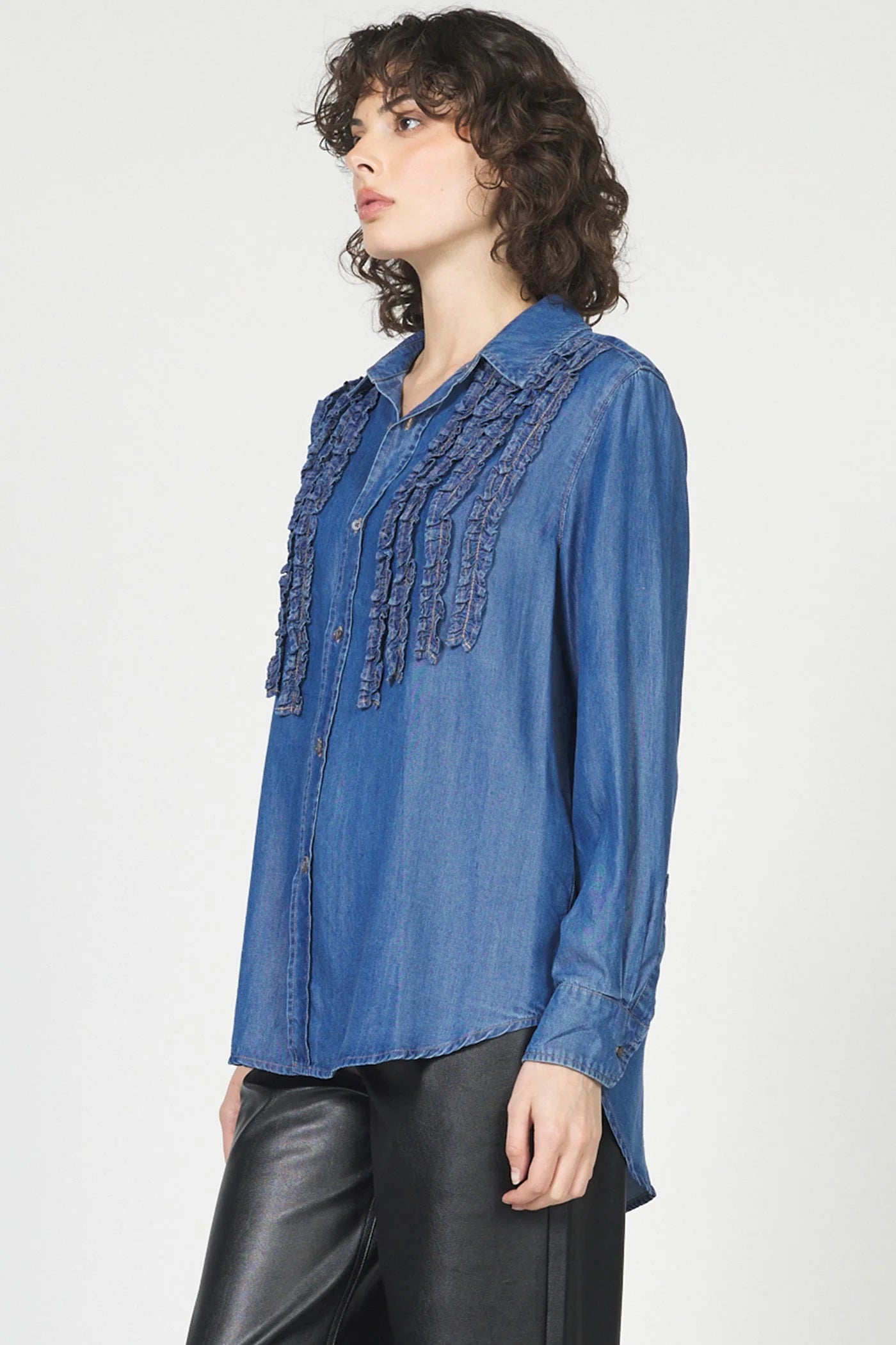 Galina tuxedo ruffles button-up featuring a sophisticated design crafted from 100% Tencel™ for an elegant and versatile look.