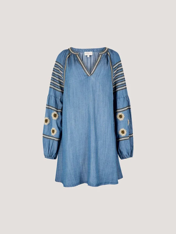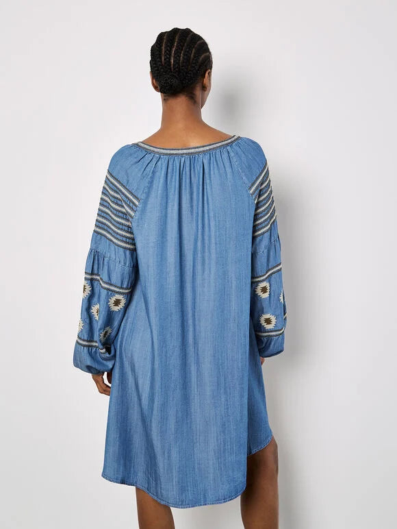 Apricot Aztec Embroidered Denim Mini Dress w/ Balloon Sleeve- Mid Blue Denim