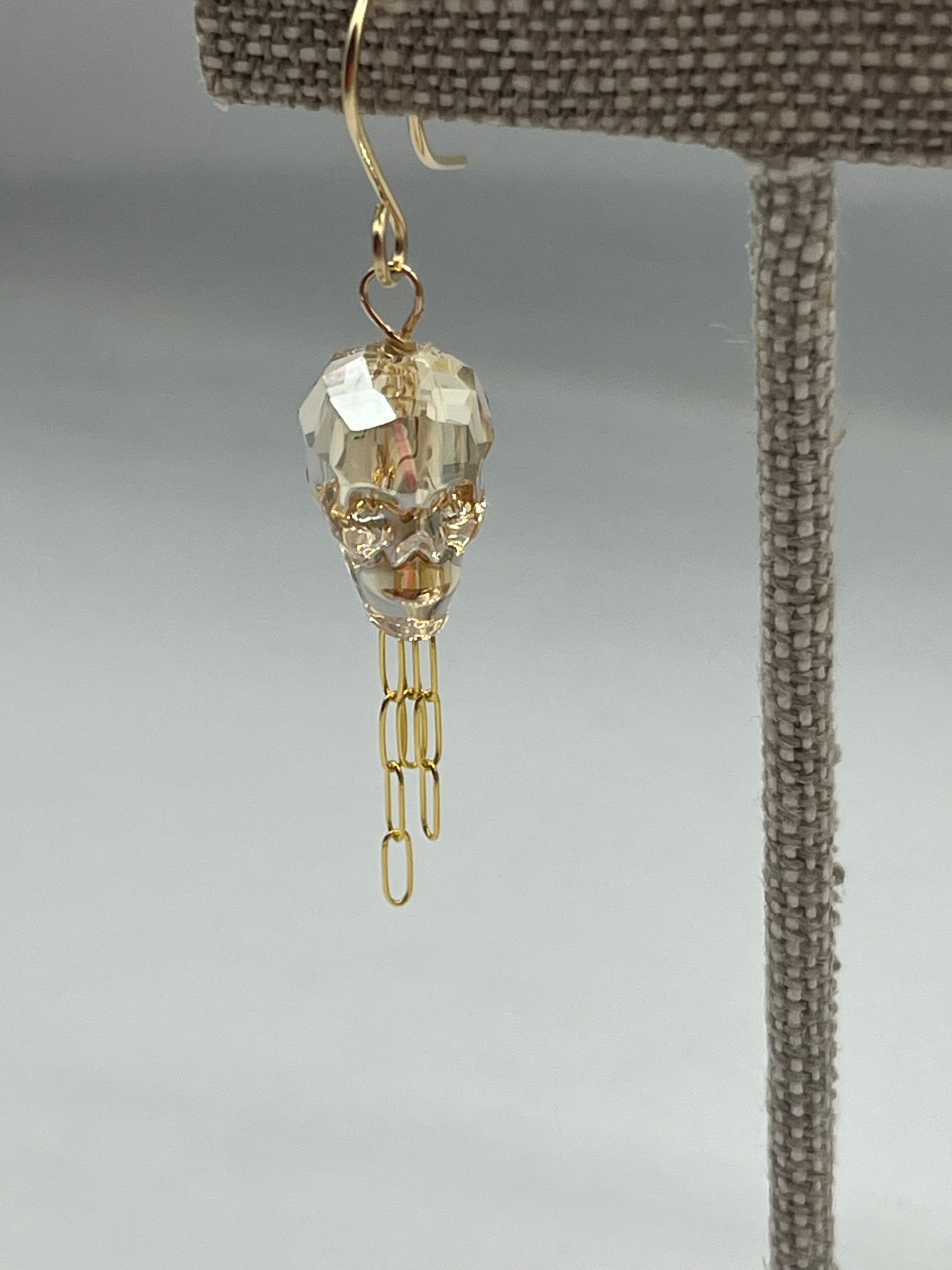 Specialty crystal skull earrings on sterling silver or 14k gold filled ear wires and chain.