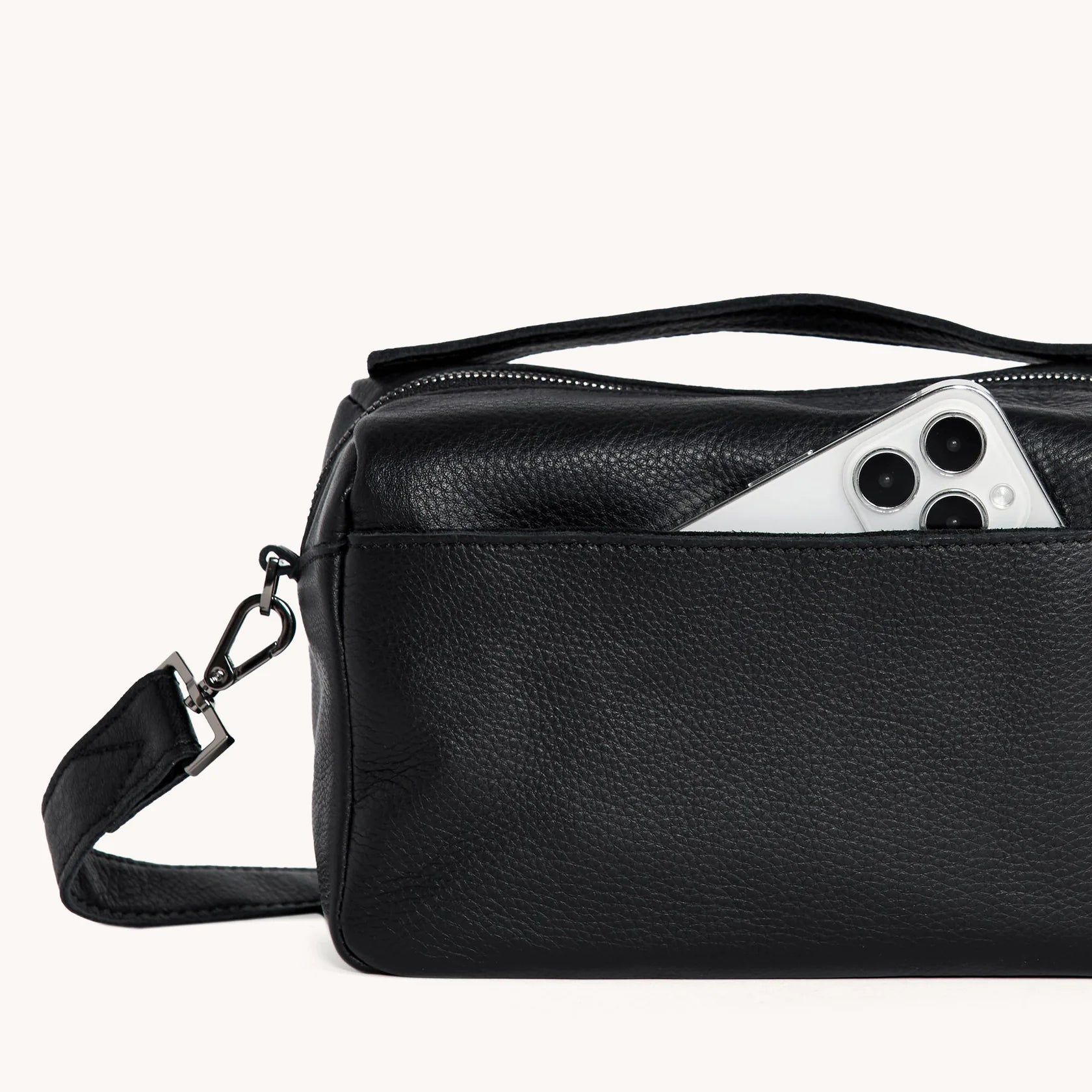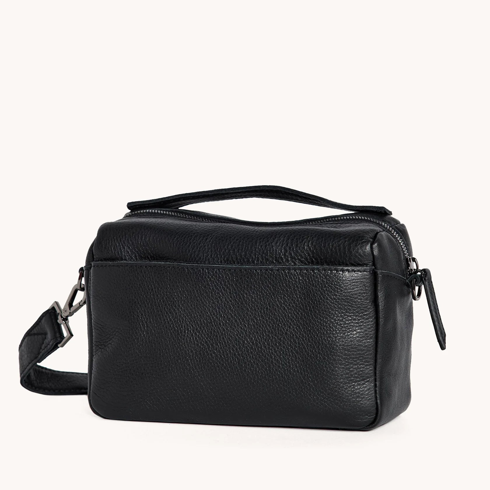 Specifically designed for customers who prefer a compact crossbody with a relaxed look, the Evan can be worn over the shoulder with our crossbody strap or can be carried by its top handle. Inspired by camera bags, with an east-west look. Crafted with classic black pebbled leather.