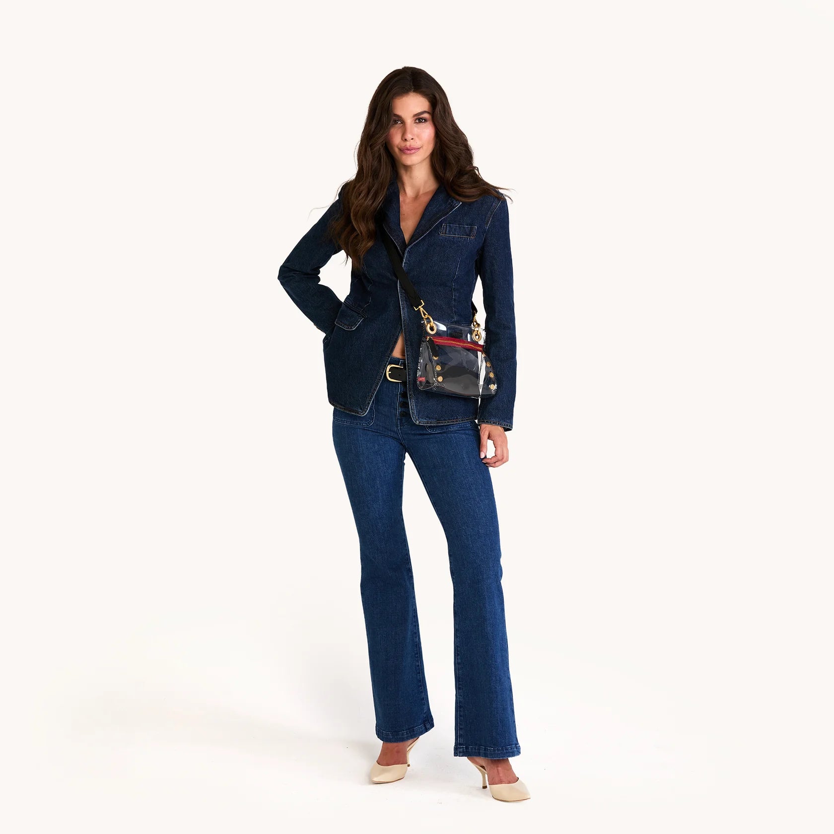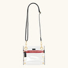 Our classic crossbody, complete with a clear, stadium-approved twist. Breeze through security in style thanks to the internet's best stadium-approved clear bag. Crafted with flexible TPU and leather trim, this guideline-ready size was designed to take on sporting arenas, concerts, festivals, airports and beyond. Plus, find your perfect fit with an adjustable crossbody strap. Adorned with a hint of our signature black leather, brushed gold hardware and an iconic red zipper.