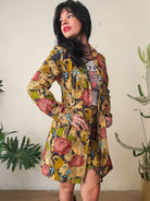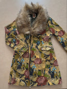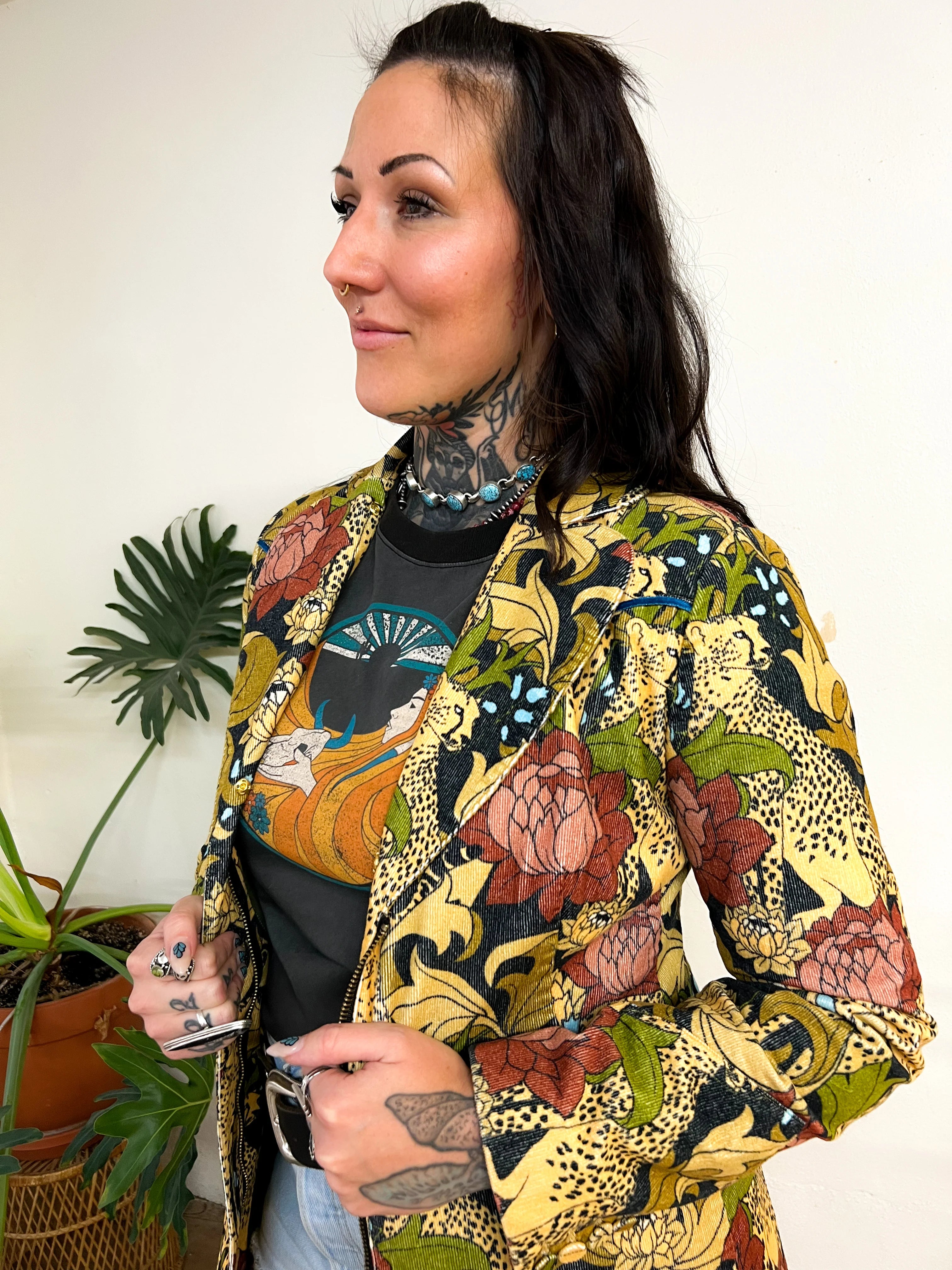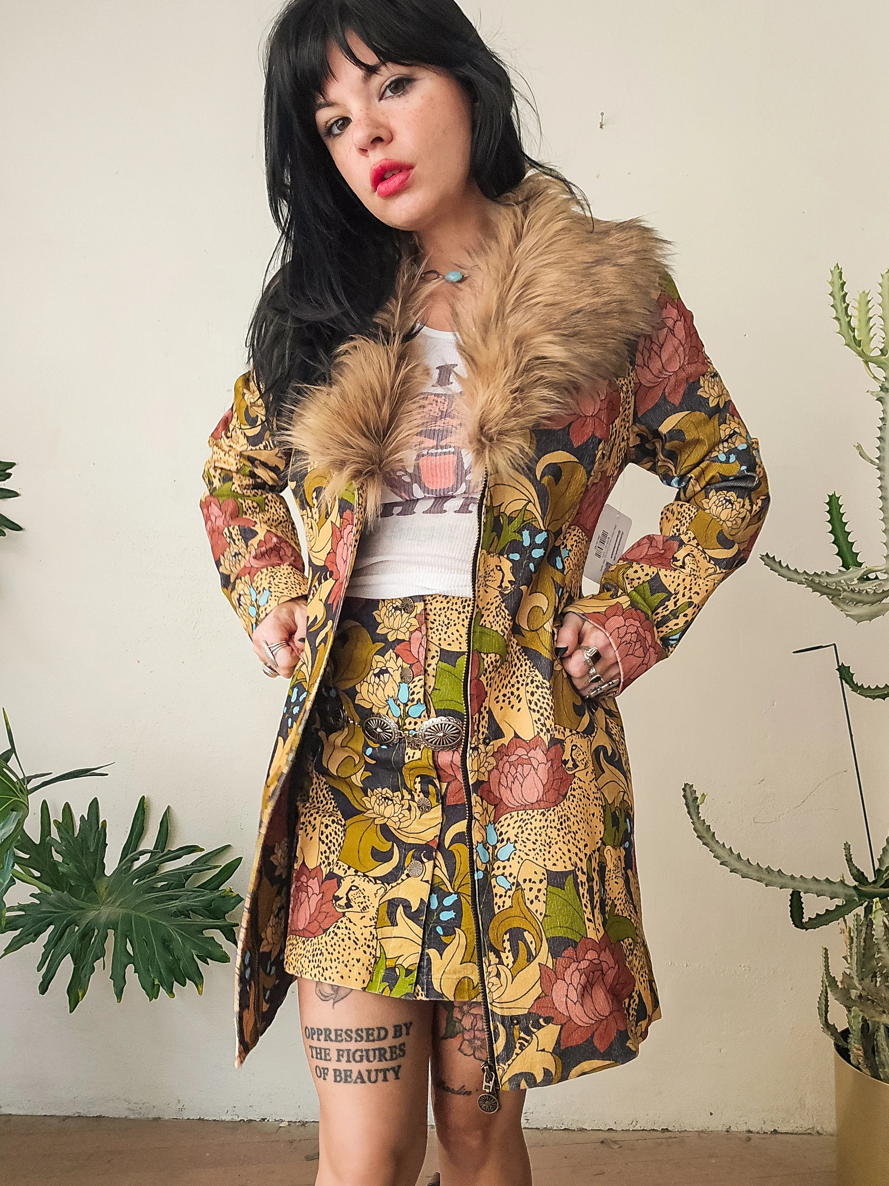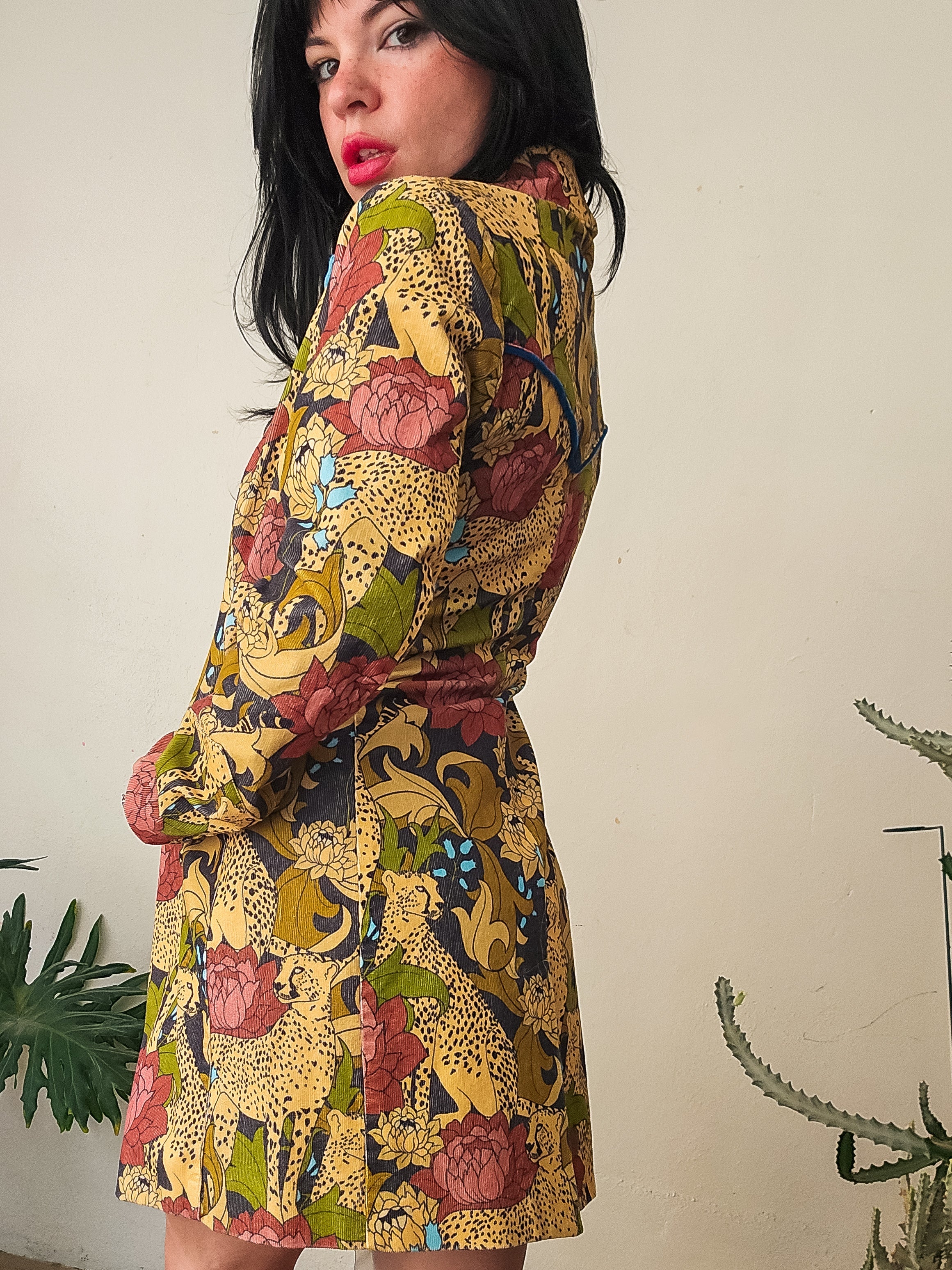 This printed cotton corduroy midi jacket is what late 60s rock icon dreams are made of. The custom cheetah floral pattern — a collaboration with artist Harley and J — is printed on high-quality cotton stretch corduroy with sky blue velvet western style piping throughout. A removable fur collar can easily snap off to take this look from business casual to winter glam.