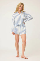 PJ Salvage Back From the Beach Long Sleeve Button Top- Ivory/Blue