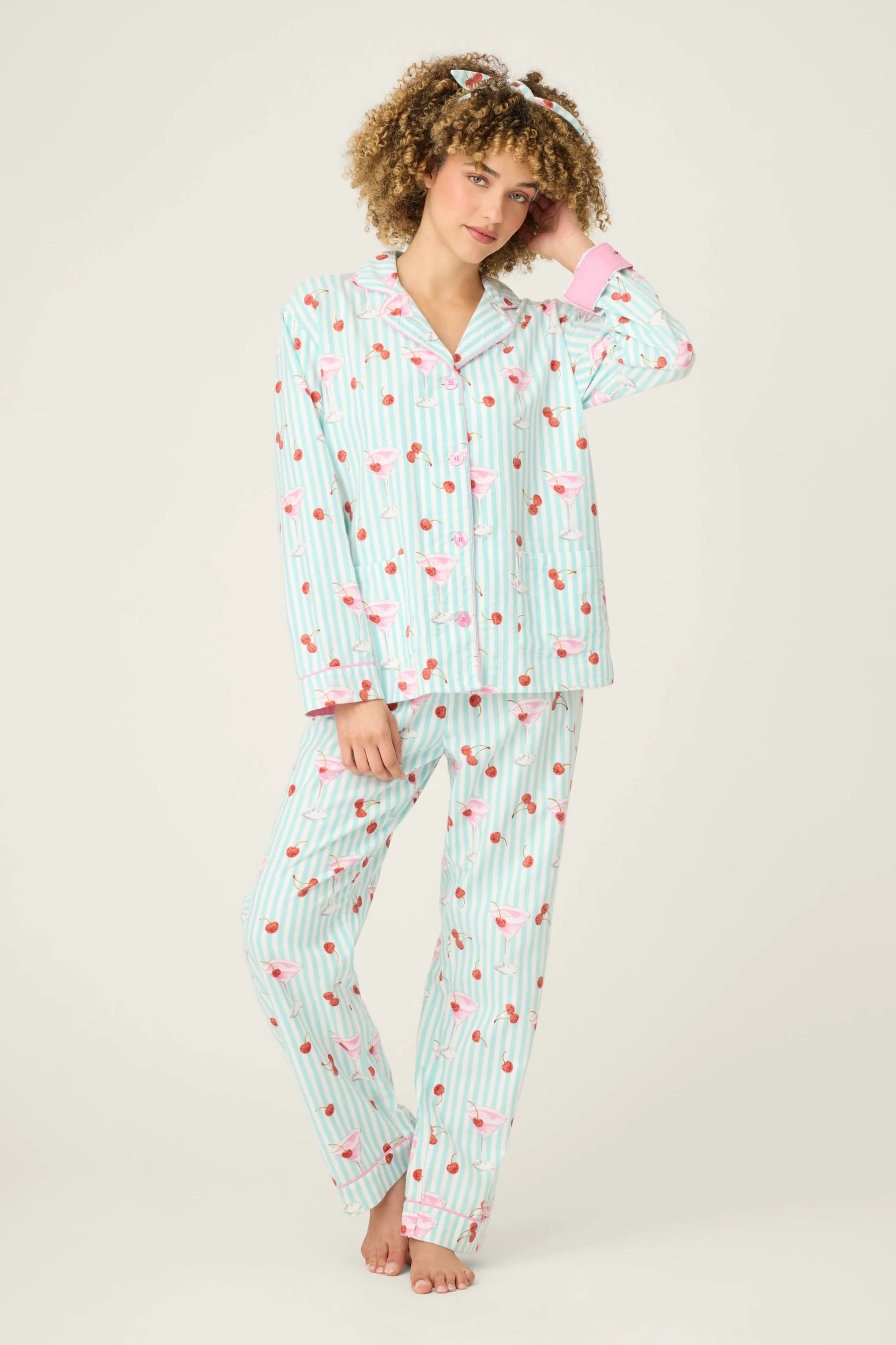 Sleep, lounge, repeat in this dreamy three-piece flannel set with a splash of happy hour charm. Made from soft cotton in a classic twill weave, it includes a button-up shirt, relaxed-fit pants, and a matching headband. Patterned with minty stripes, pink cocktails, and cheery little cherries, it’s a playful pick for sleepy nights, slow mornings, or unwinding with your favorite drink in hand.