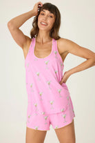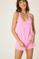 Cheers to cozy nights in! This playful martini-print sleep tank is the perfect way to toast to relaxation, crafted from a soft cotton-modal blend in bubblegum pink. It features a racerback design and a curved hem that’s just as fun as it is relaxed. The neckline is adorned with whimsical scalloped embroidery, adding a quirky touch to the classic silhouette. Pair it with the matching shorts or pants for a coordinated set that’s ready for a laid-back night in.