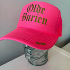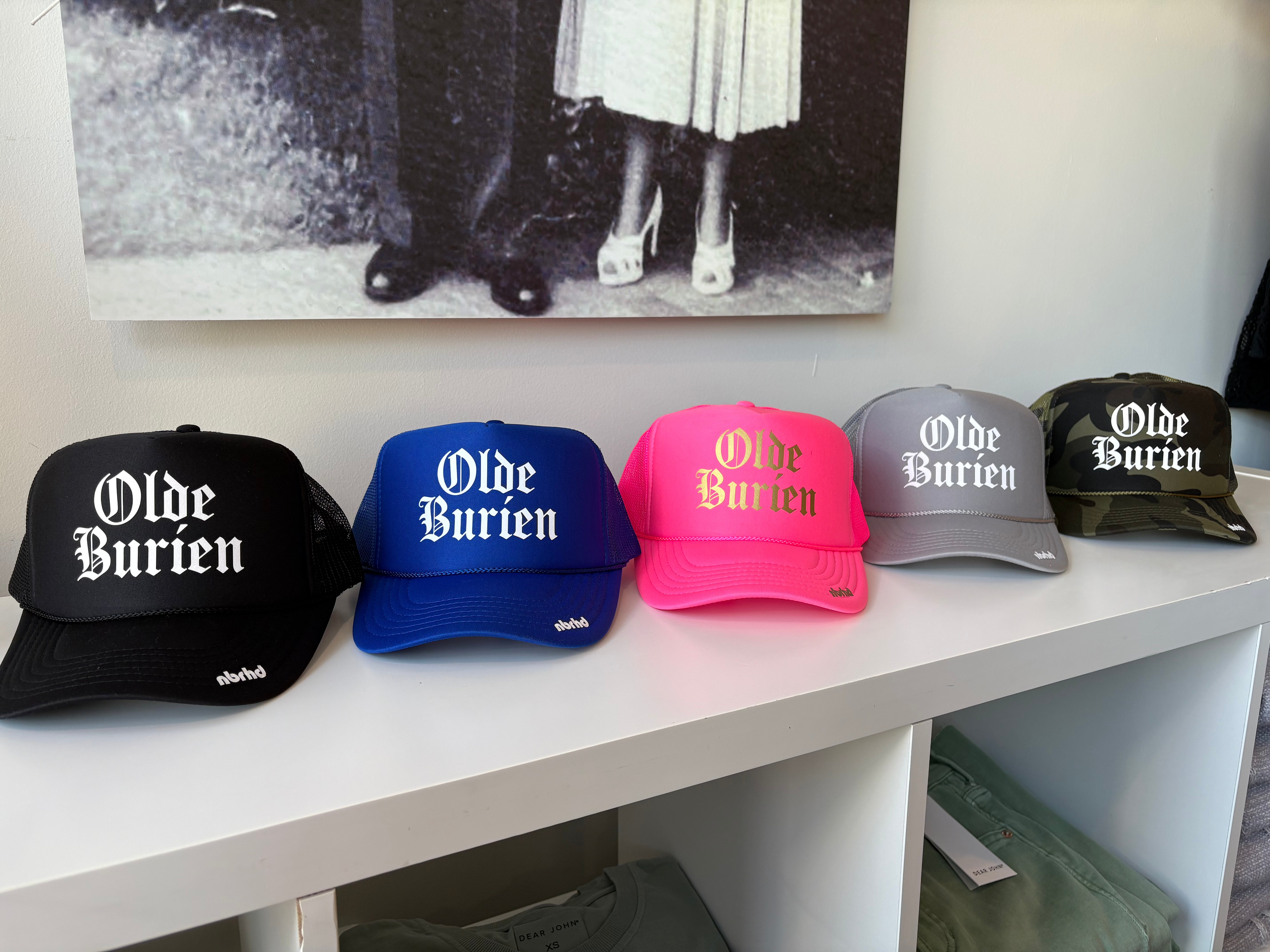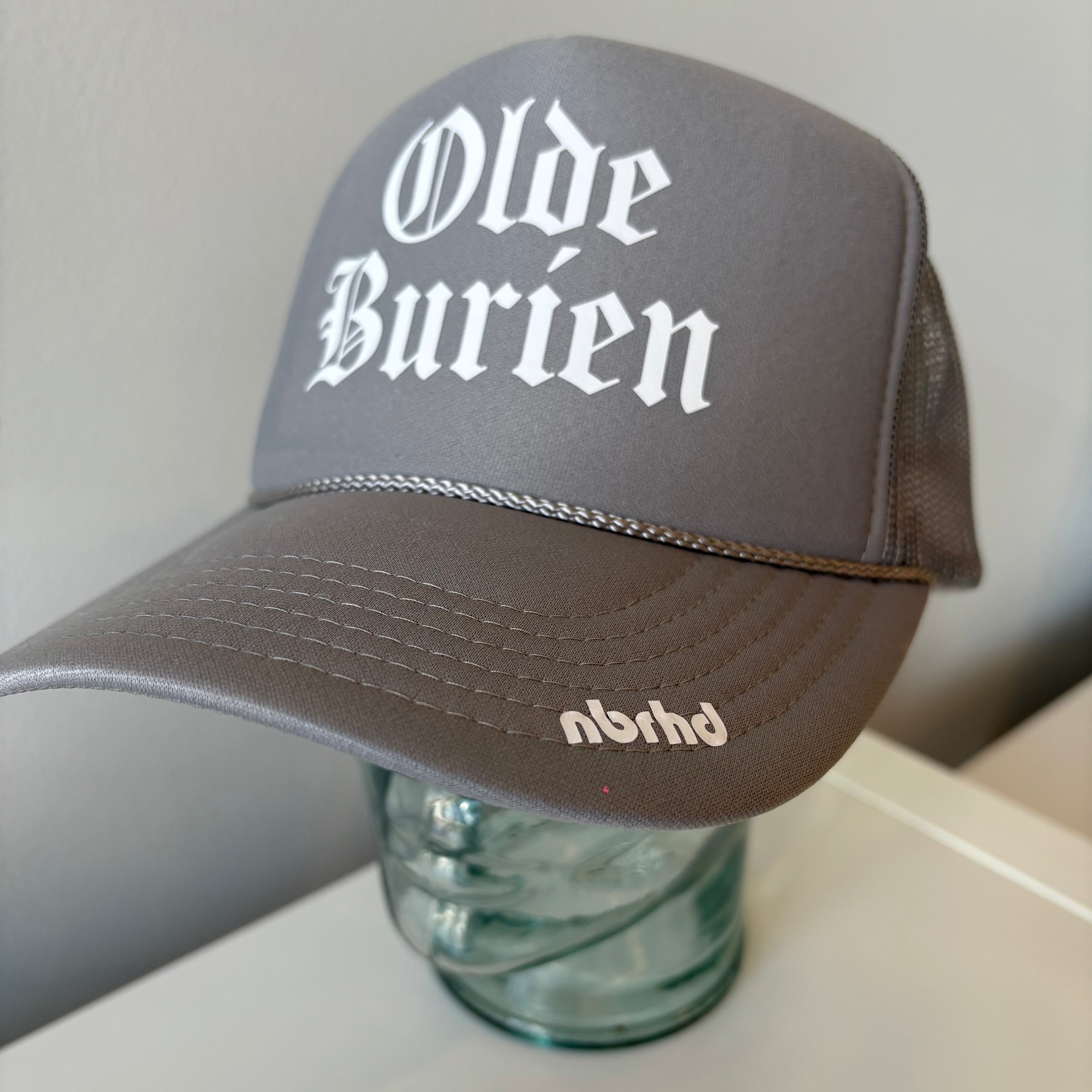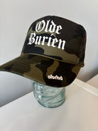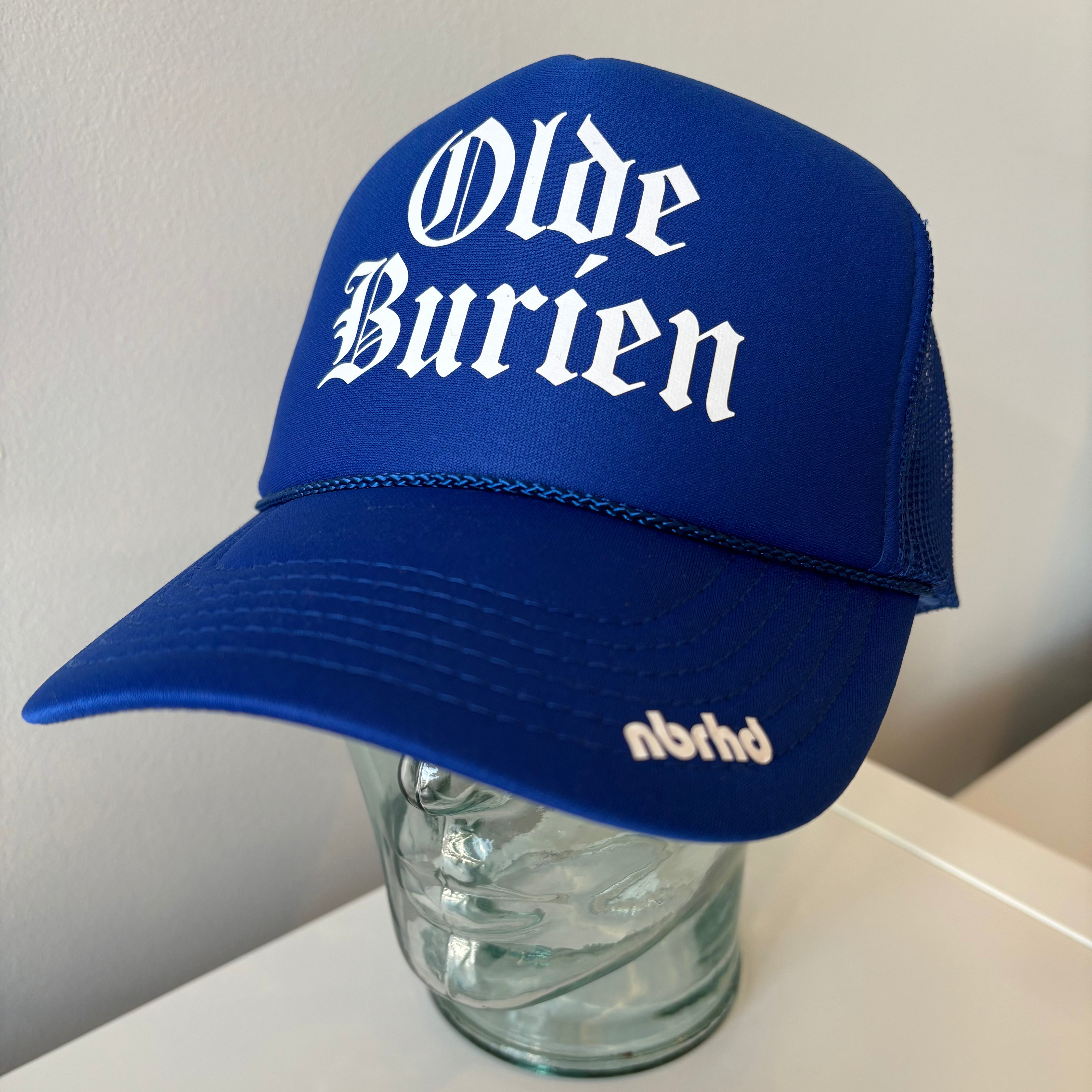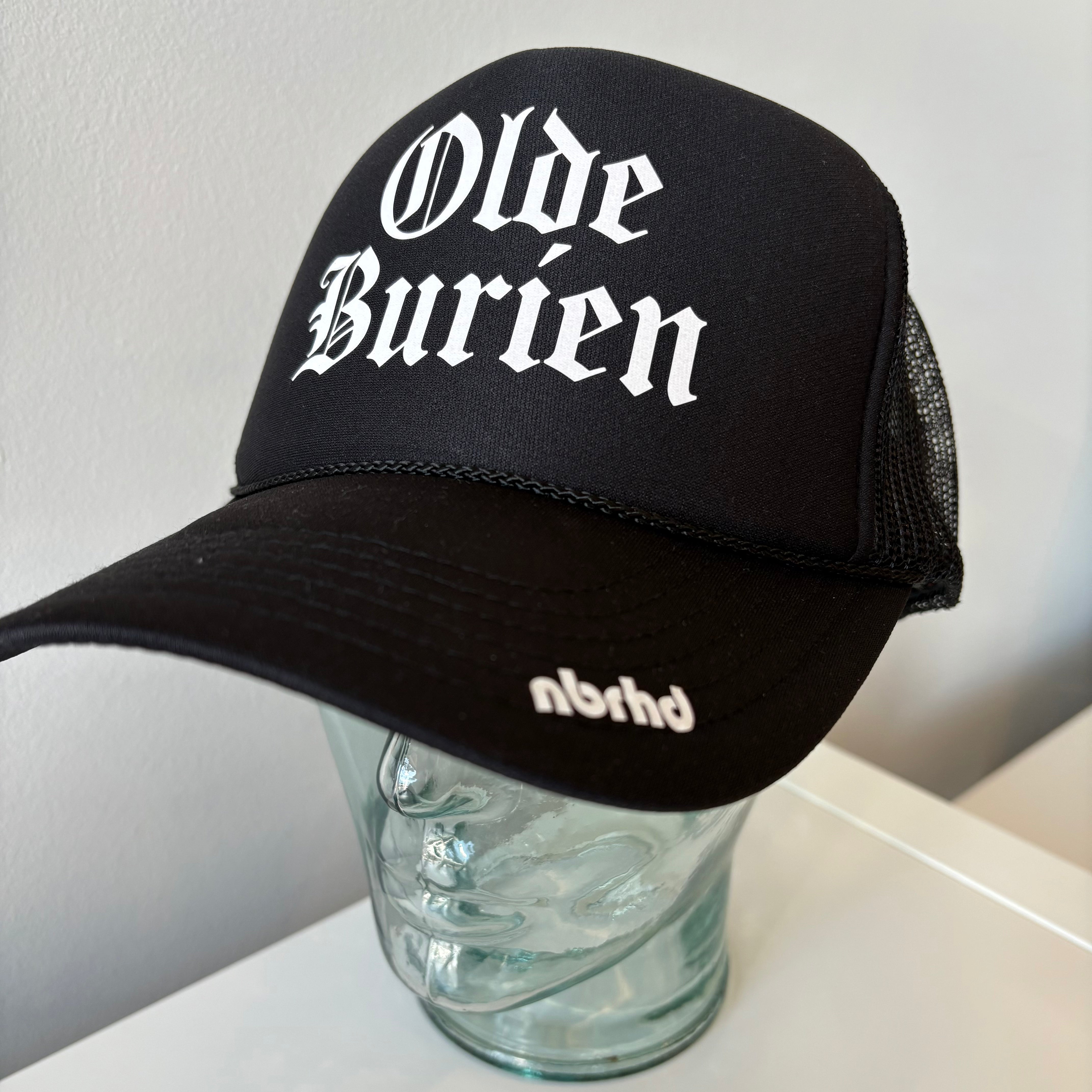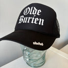 ‘OLDE BURIEN’ on the front panel of a classic mesh trucker cap, comfortable terry cloth inner band, fitted with an adjustable snapback.