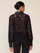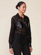 This blouse is the perfect blend of leather and lace. The long sleeve sheer button up is rimmed with crinkle vegan leather at the collar, cuffs, pockets and placket. Pair with the ANTHEM lace midi skirt for a head to toe modern set.