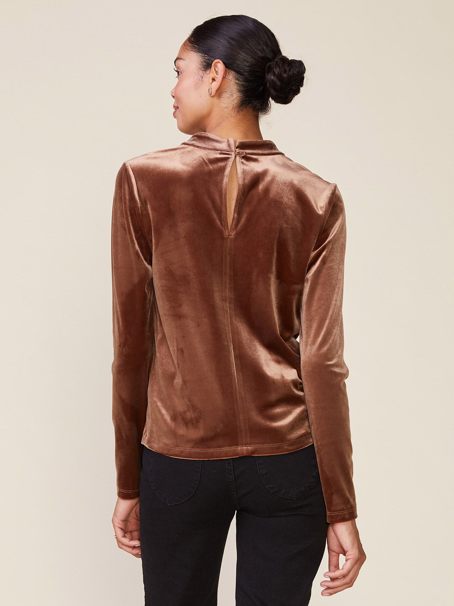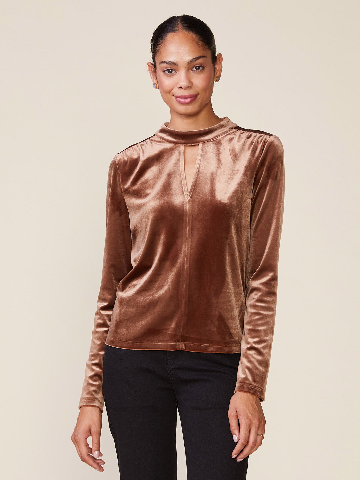 Anthem Mock Neck Front Keyhole Split Velvet Top- Mink