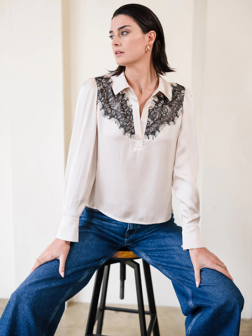 Anthem the Label Lace Yoke Long Sleeve Satin Blouse- Champagne