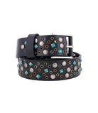 Make a statement around your waist without even saying a word. Tammin II shows off your good taste with cool circular brass & silver grommets, circular flat silver studs and square, turquoise-colored studs. Silver buckle hardware also makes this a stunner, and you can always swap out the buckle for your coveted personal one.
