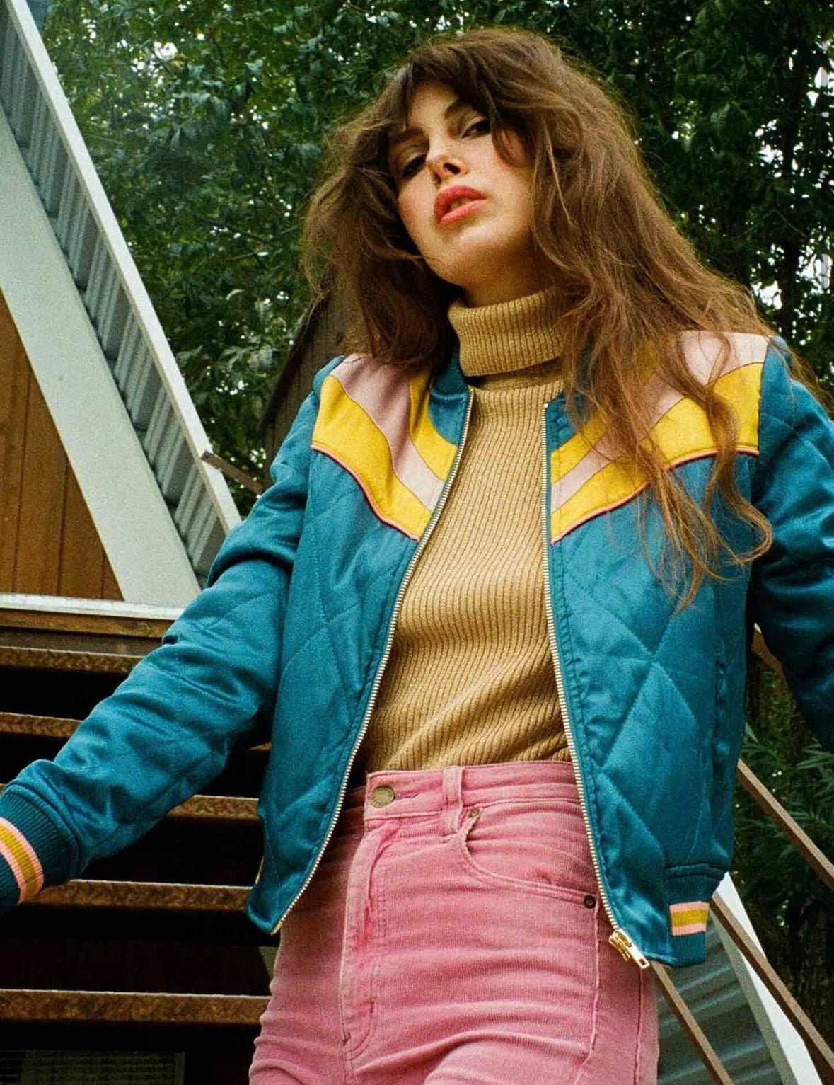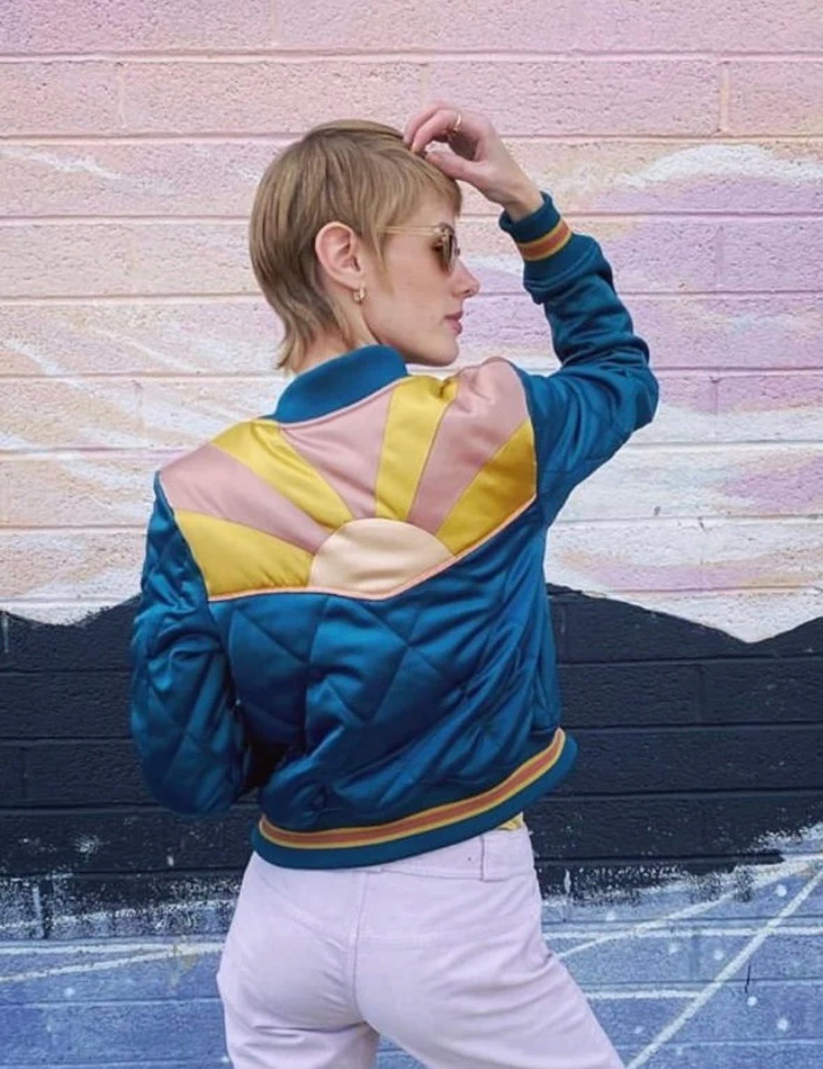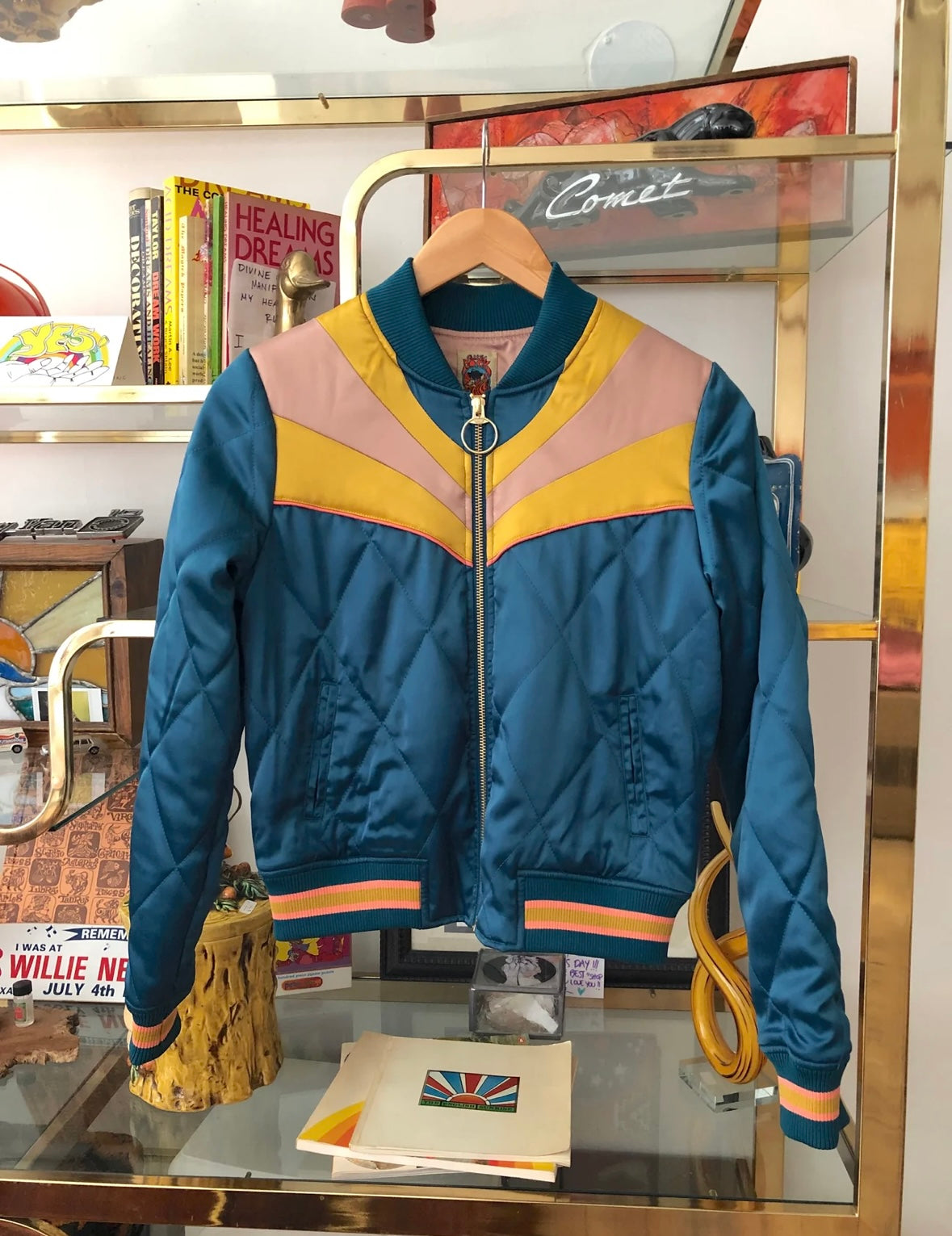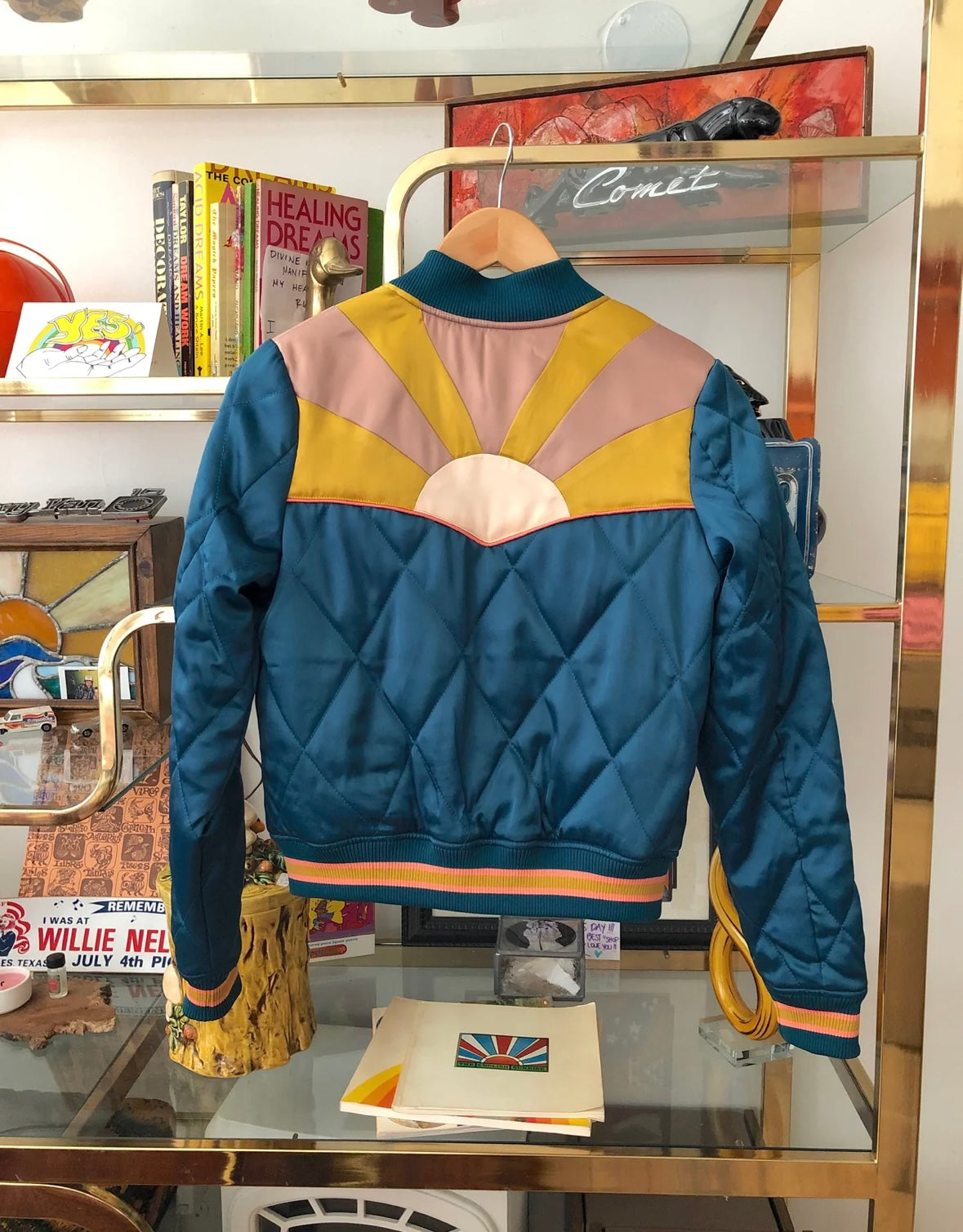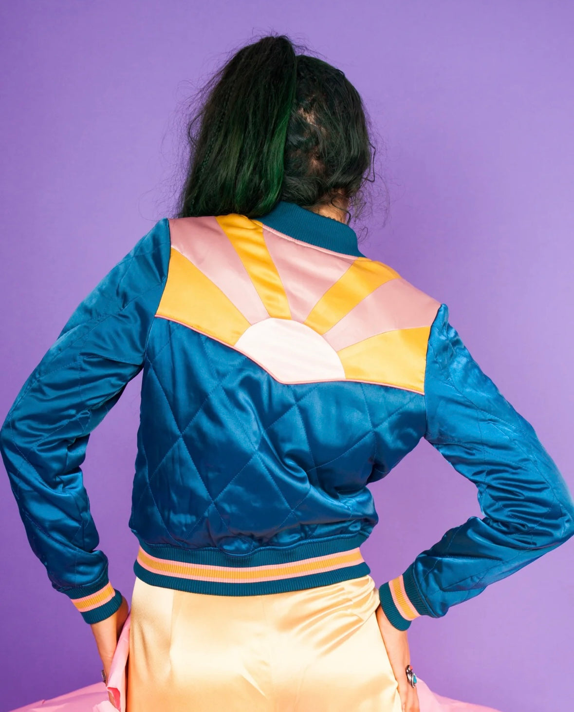 1970’s ski attire meets the Arizona desert sunset in the Peacock Rising Sun Bomber Jacket. Featuring a teal peacock blue body with bright coral piping and mustard + mauve sunburst.