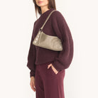 This fresh, of-the-moment bag is a must-have companion for nights on the town. Featuring a slouchy but current shape, in our classic pewter leather, this versatile little number transitions from a wristlet to a shoulder bag in seconds flat. The Kyle also includes a removable and adjustable crossbody strap, so you can go hands-free and allows the Kyle to be worn 3 different ways depending on your look!