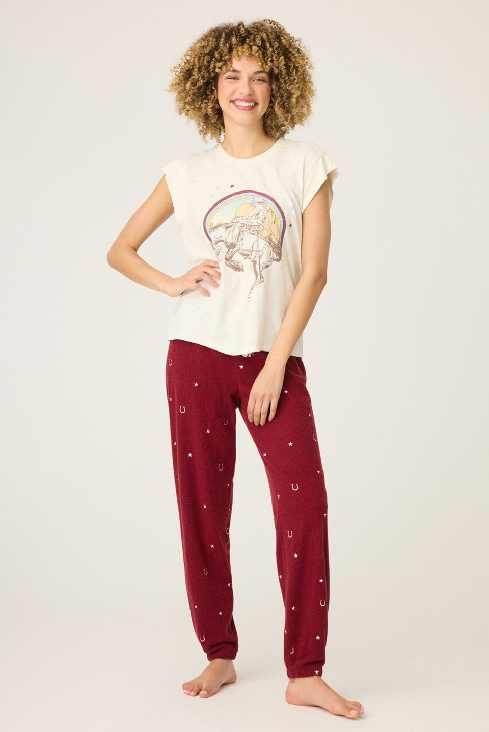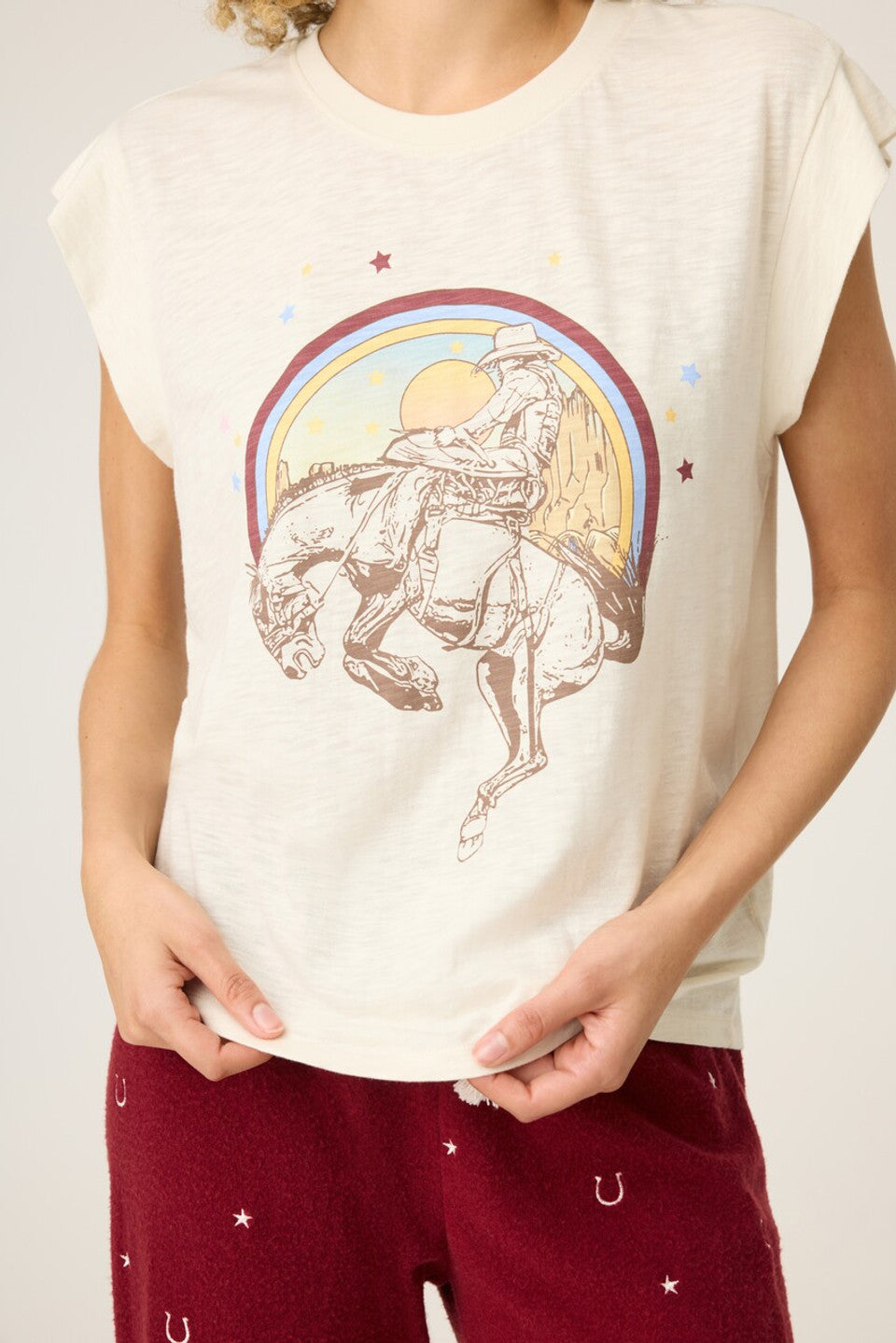 Saddle down in the soft comfort of this cotton-and-modal slub top stamped with retro-inspired graphics.