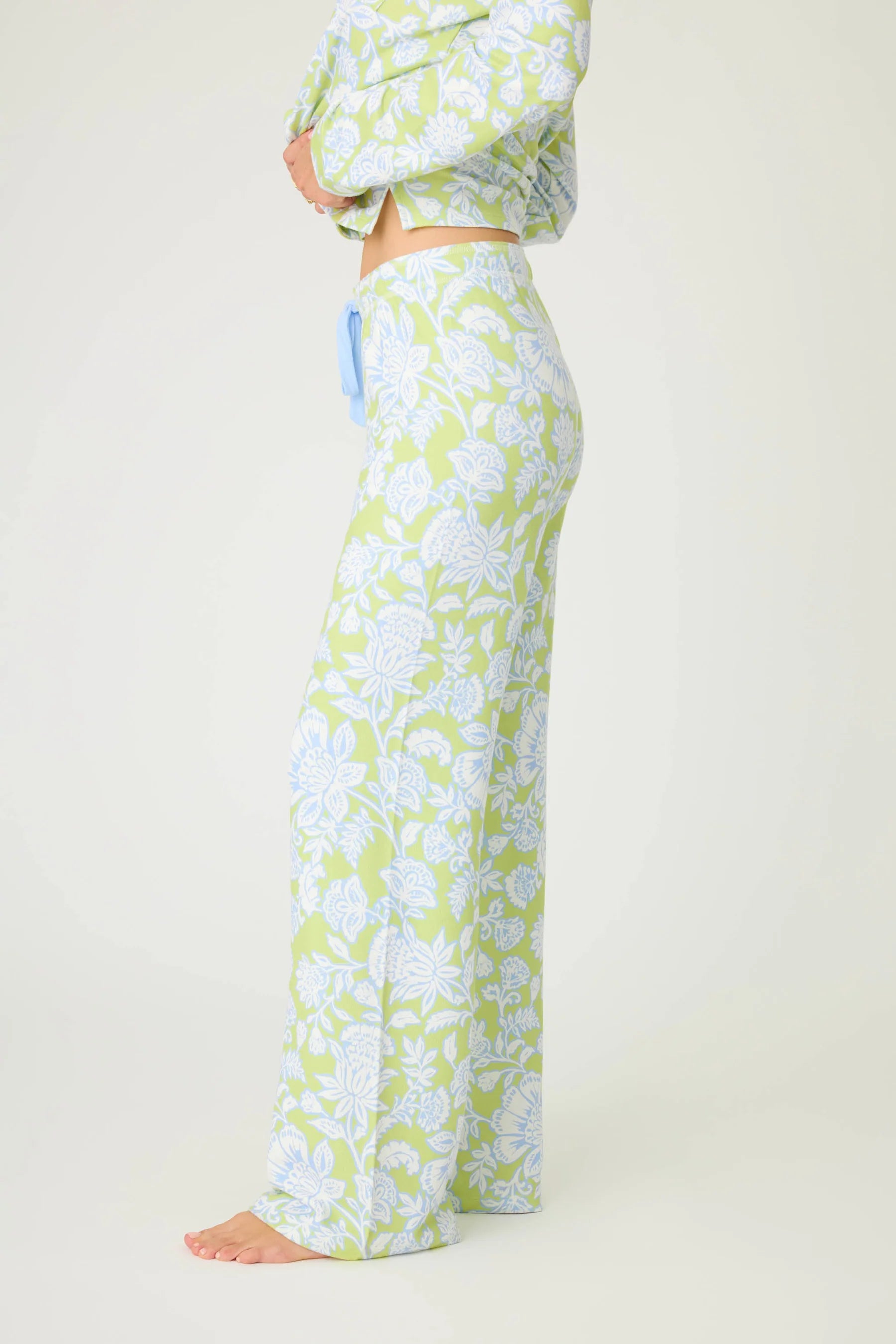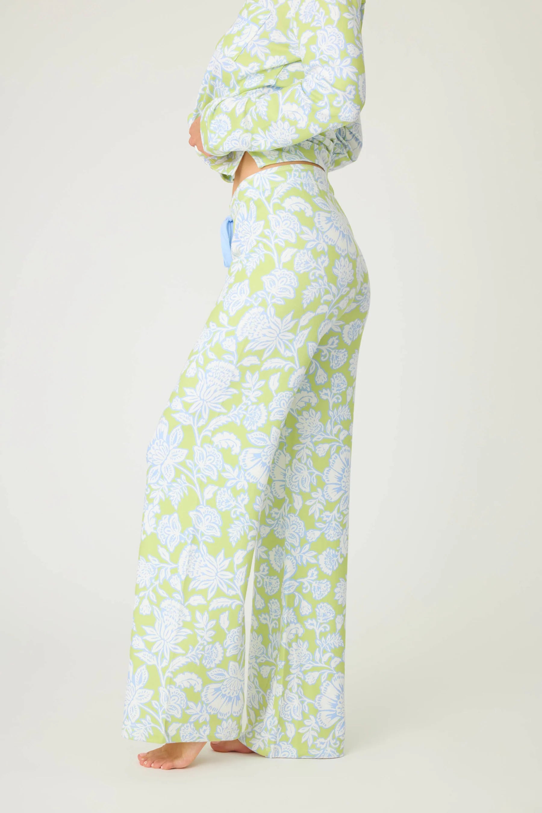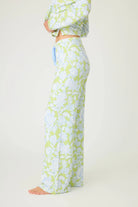 - Women’s full-length lounge pants in electric lime with a floral print, wide-leg fit, elastic waistband, and light blue drawstring, made from soft butter jersey with stretch for comfort.