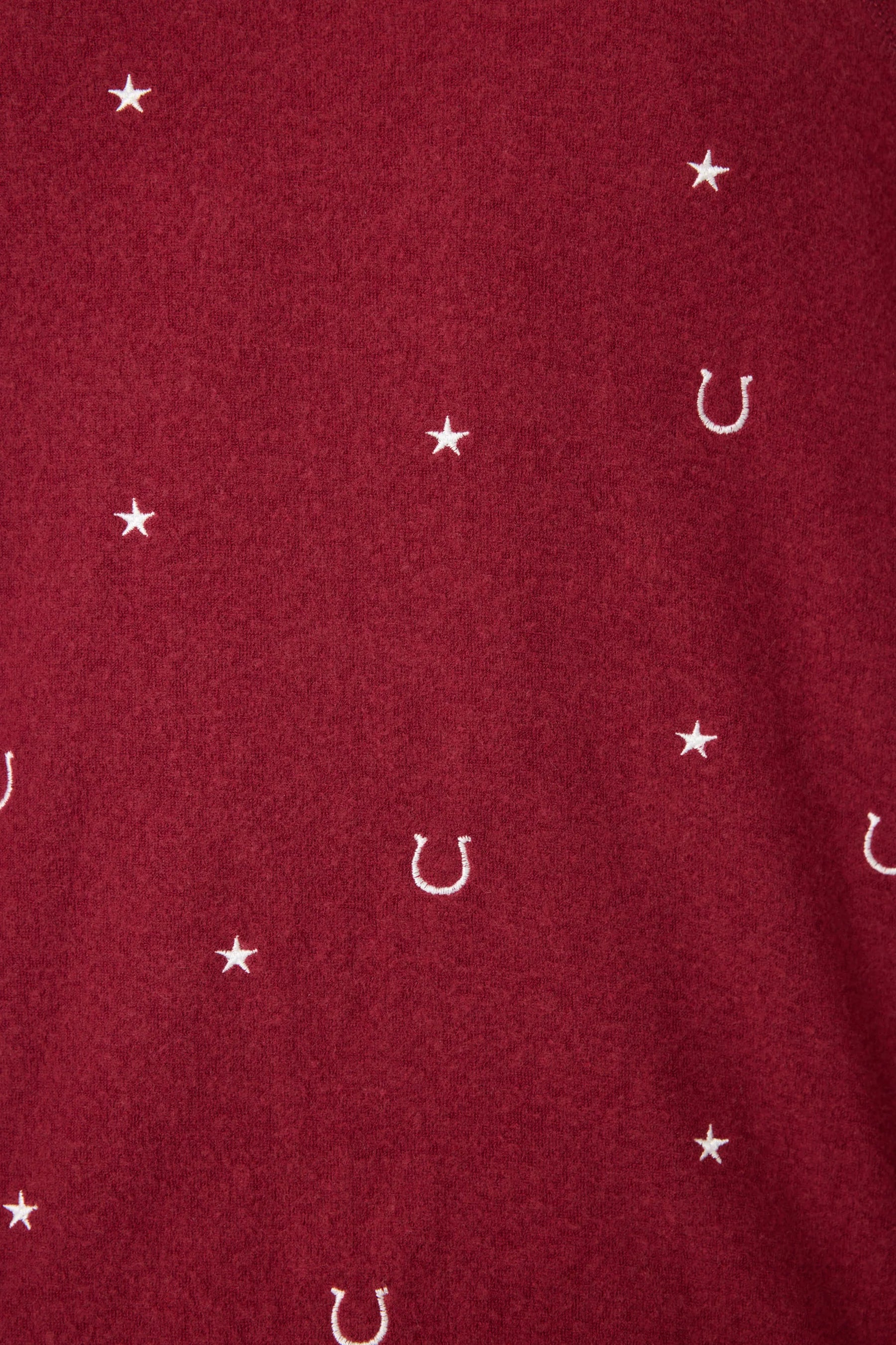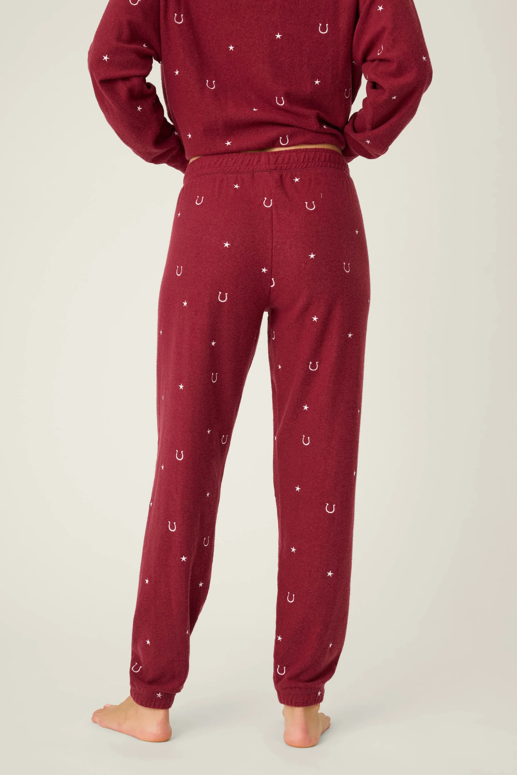 Cozy meets lucky charm in these burgundy fleece lounge pants, patterned with white horseshoes and stars for a subtle Western nod. The relaxed fit, drawstring waist, and banded cuffs make them just as perfect for kicking back at home as they are for a casual coffee run.