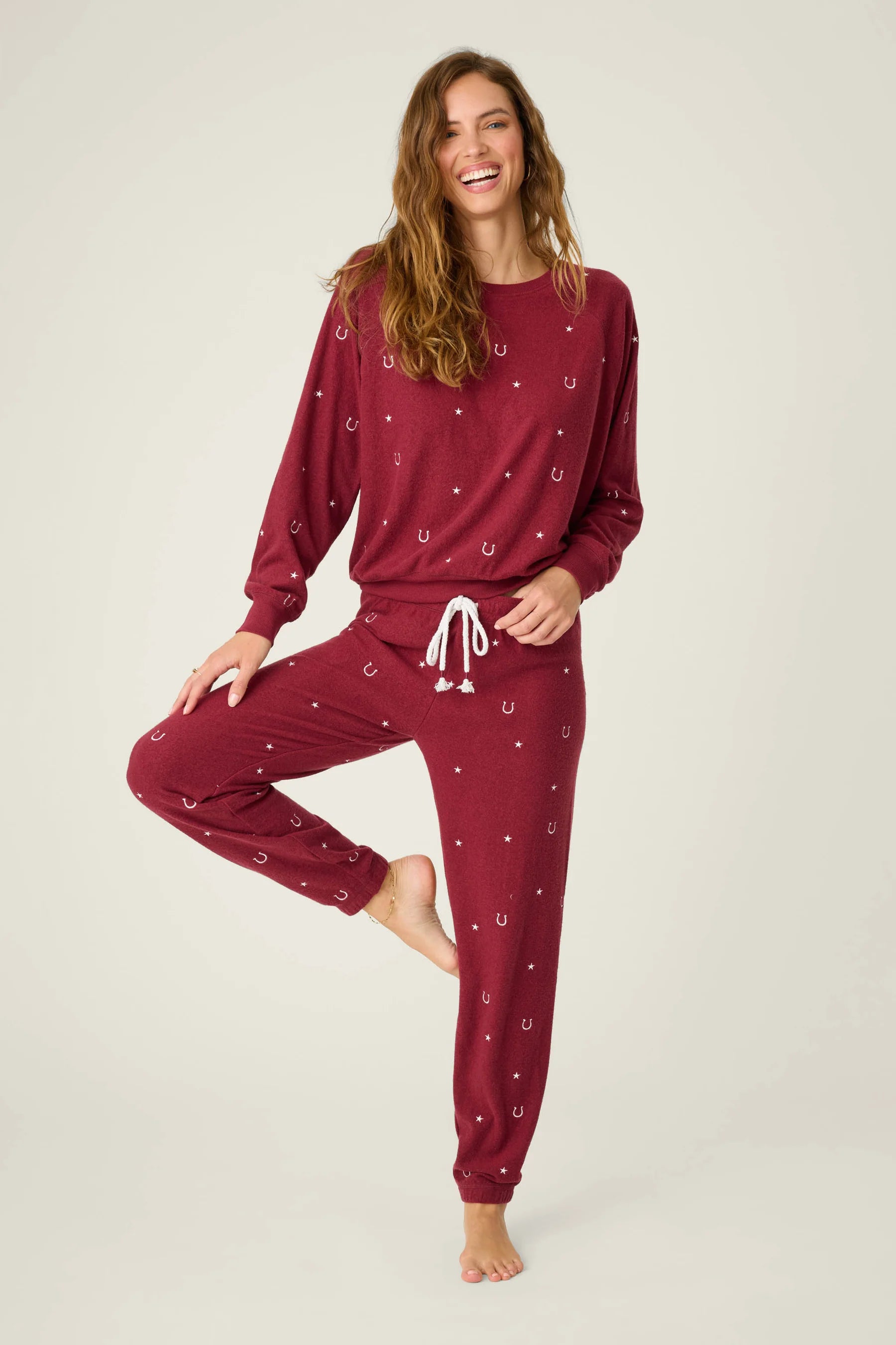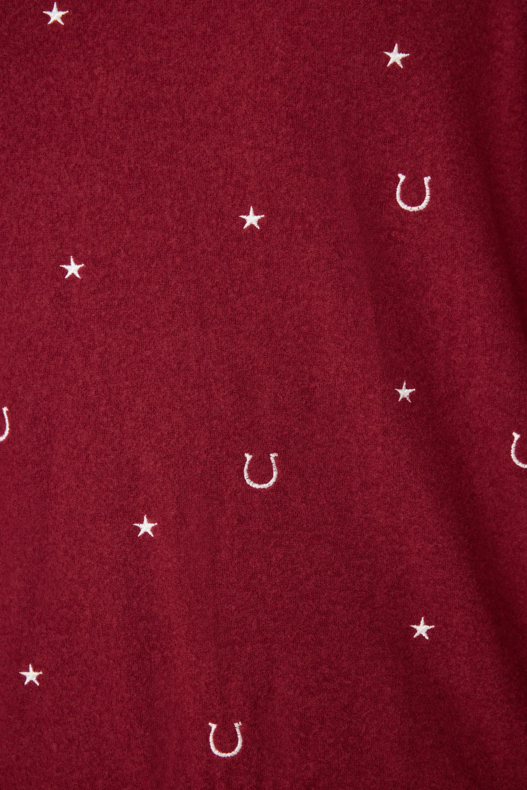Western charm meets everyday comfort in this burgundy fleece crewneck. Patterned with white horseshoes and stars, it’s finished with ribbed trim for a snug, cozy fit that works just as well with lounge pants as it does with denim.