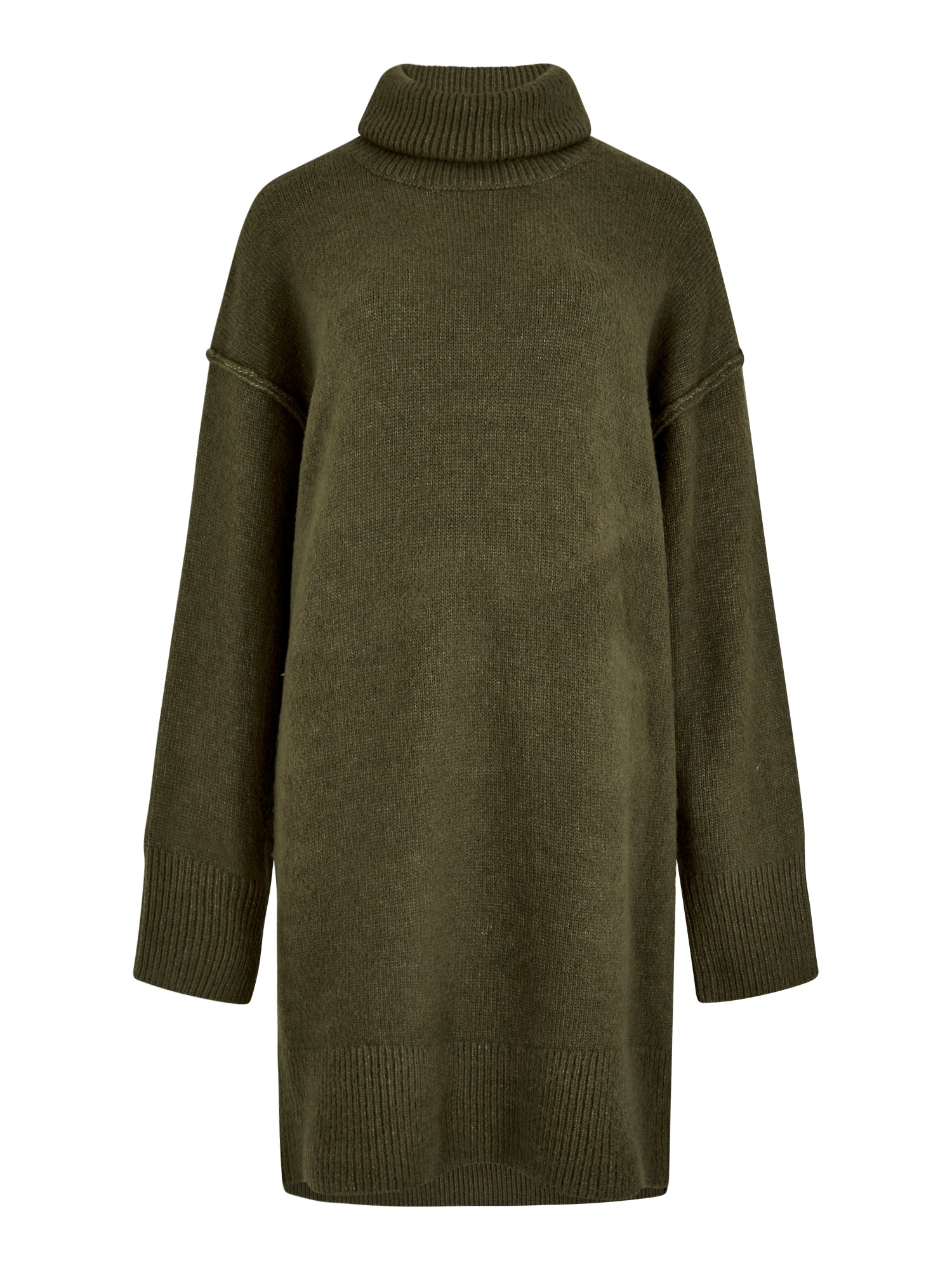 Apricot Roll Neck Oversized Raw Edge Sweater Dress- Khaki