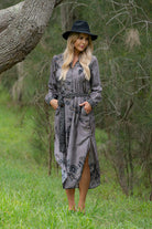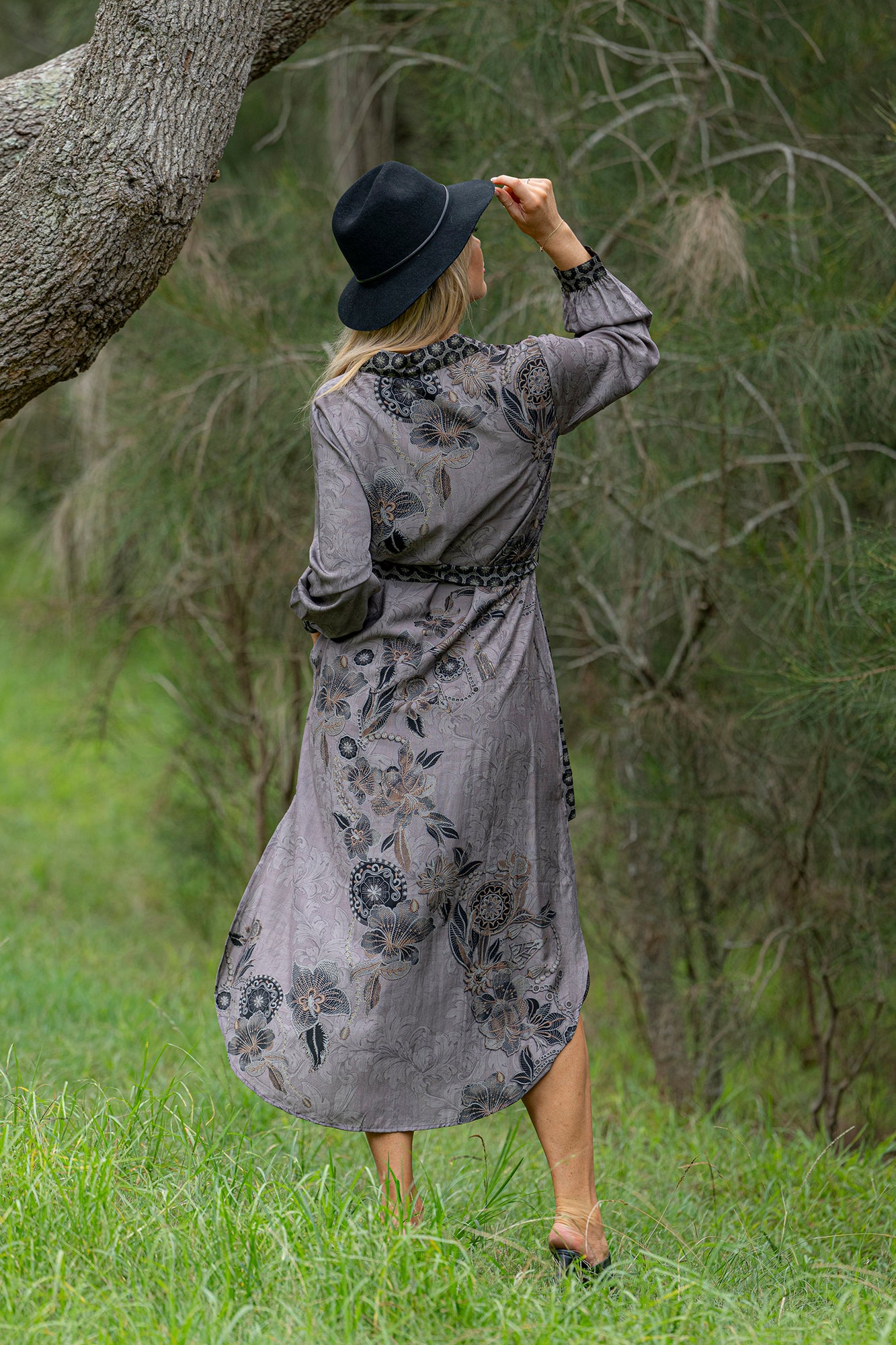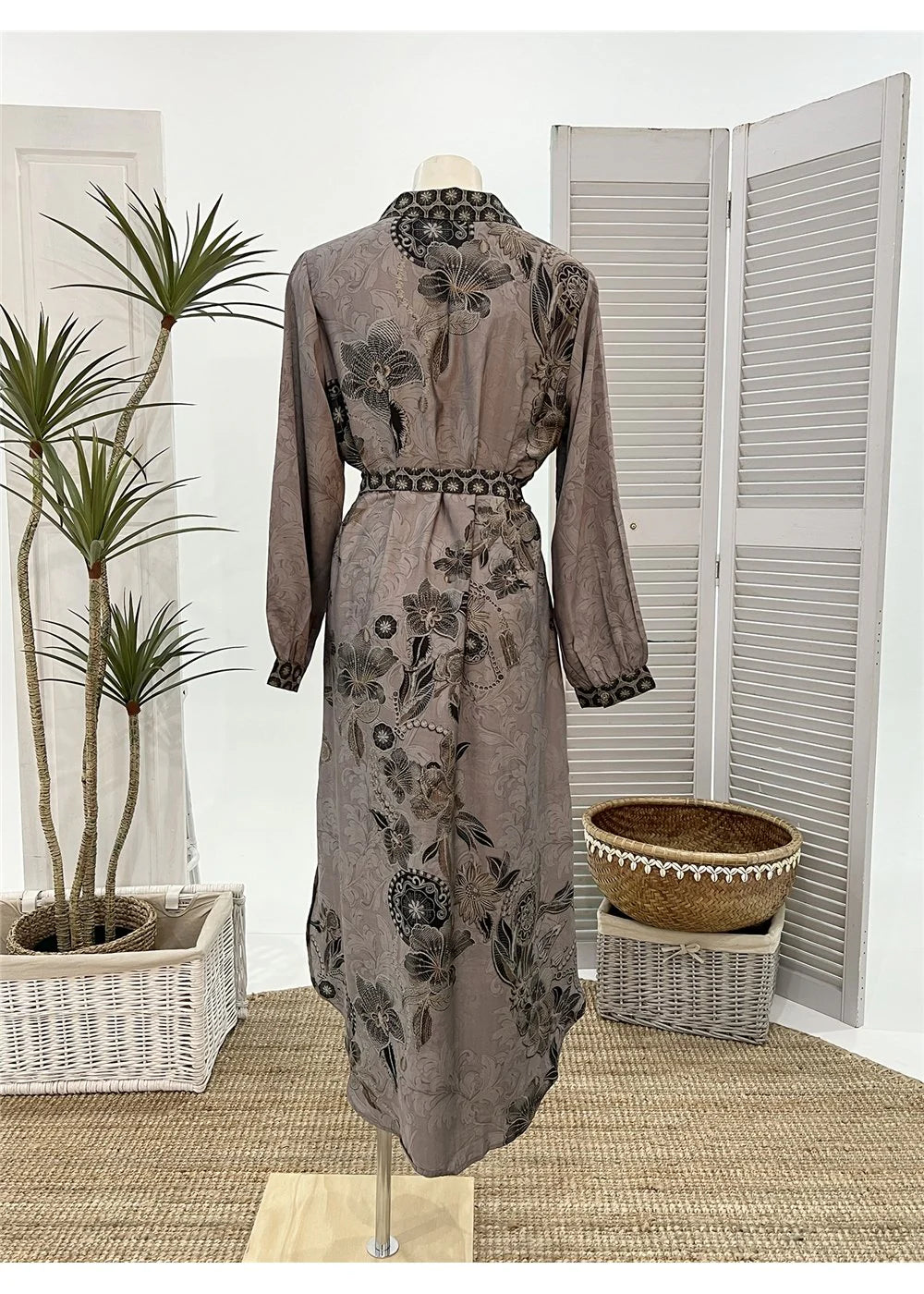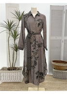 Charmaine Buttoned Dress has a collar, buttons down the front and a matching sash.  Side Pockets and long sleeves.