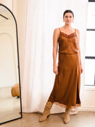 - Our satin midi skirt drapes effortlessly on the body offering a flattering fit. A mid-thigh slit, and delicate lace trim give this satin skirt a feminine, romantic feel perfect for elevated looks and special occasions.