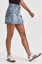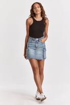 Super high rise skirt with cargo flap pockets. The coveted fit that graces the waist and effortlessly embraces the the hip and thigh. Skirt inseam on comfort stretch denim of desirable elegance accented with hand sanding whiskers at hip, side seam panel, cut off hem details.