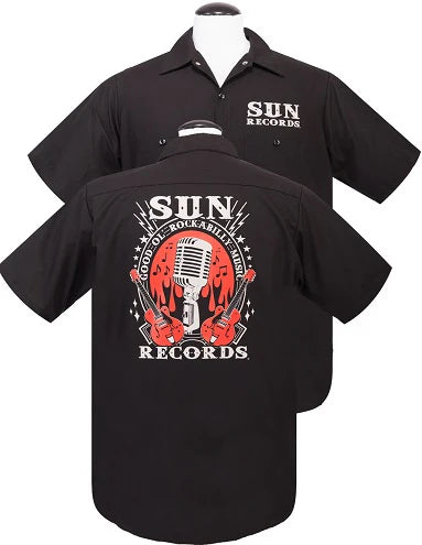The iconic Sun Records mic is now available on this awesome black rockabilly workshirt! The Sun Records Rockabilly Music Workshirt features the Sun logo on the front of the chest, custom electric mic and guitars artwork on the back, and two functional front chest pockets.