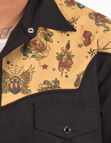 This Tattoo Flash inspired Western is the perfect shirt for all those tattoo and car shows! This slim cut shirt has a bit of an edge that meets old time flair. Features snap buttons and two functional front pockets. Grab yours today!