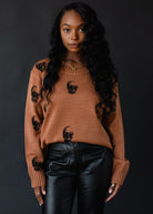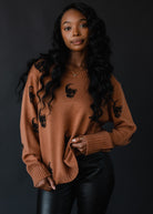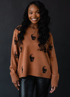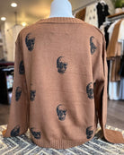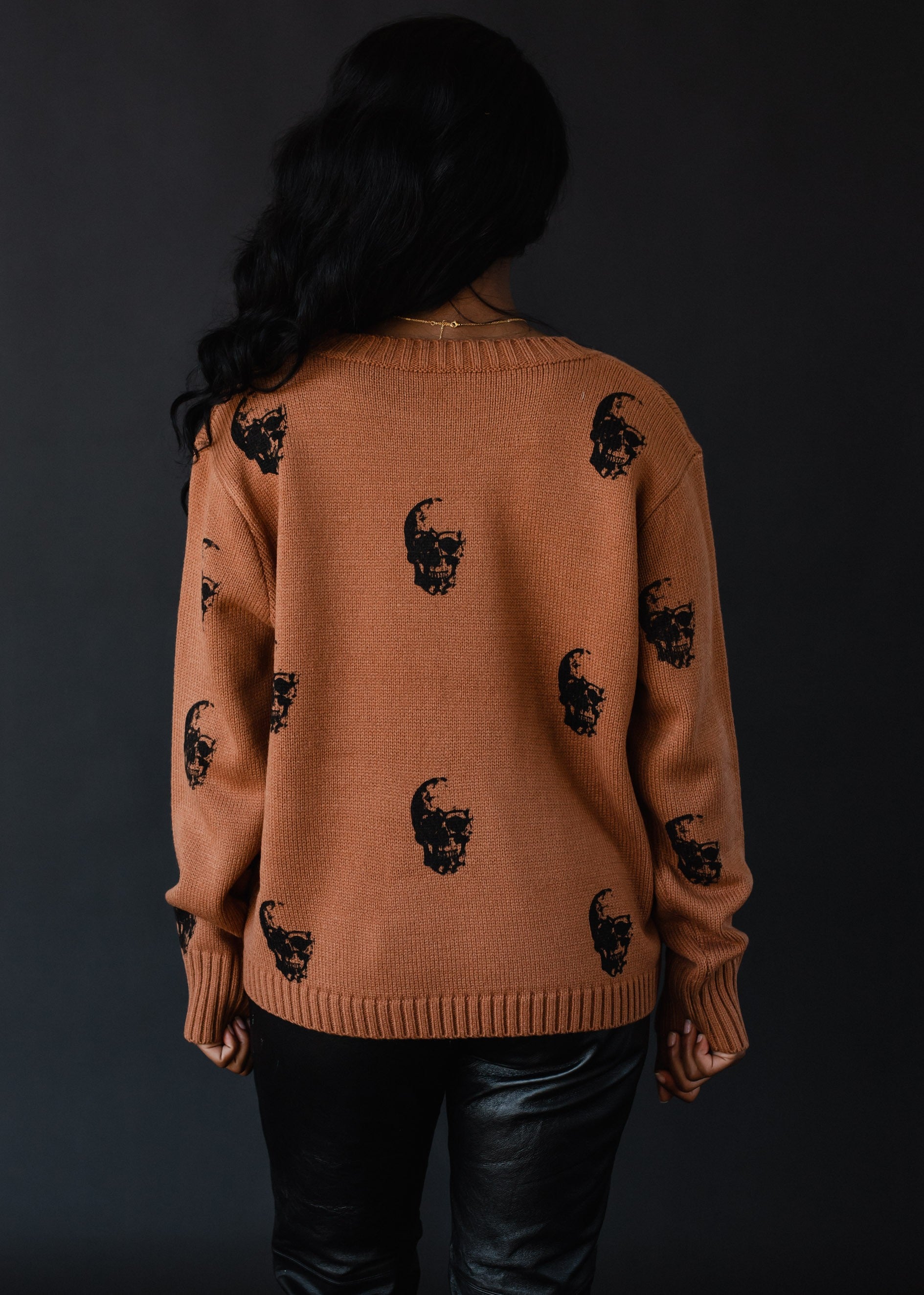 Thick knit sweater in Brown with black skull designs on the front & back.