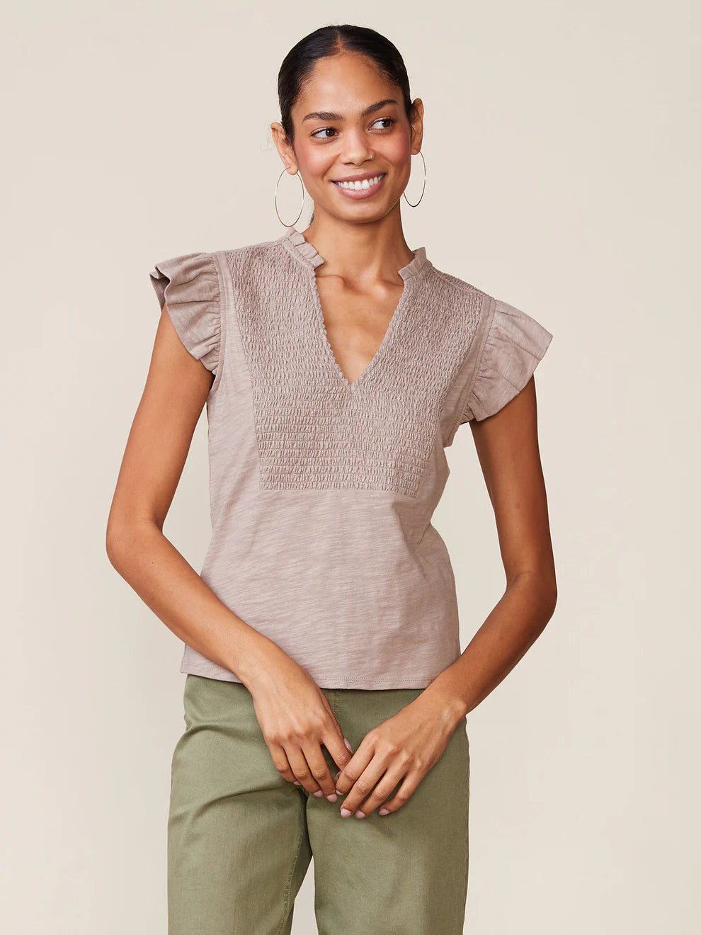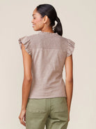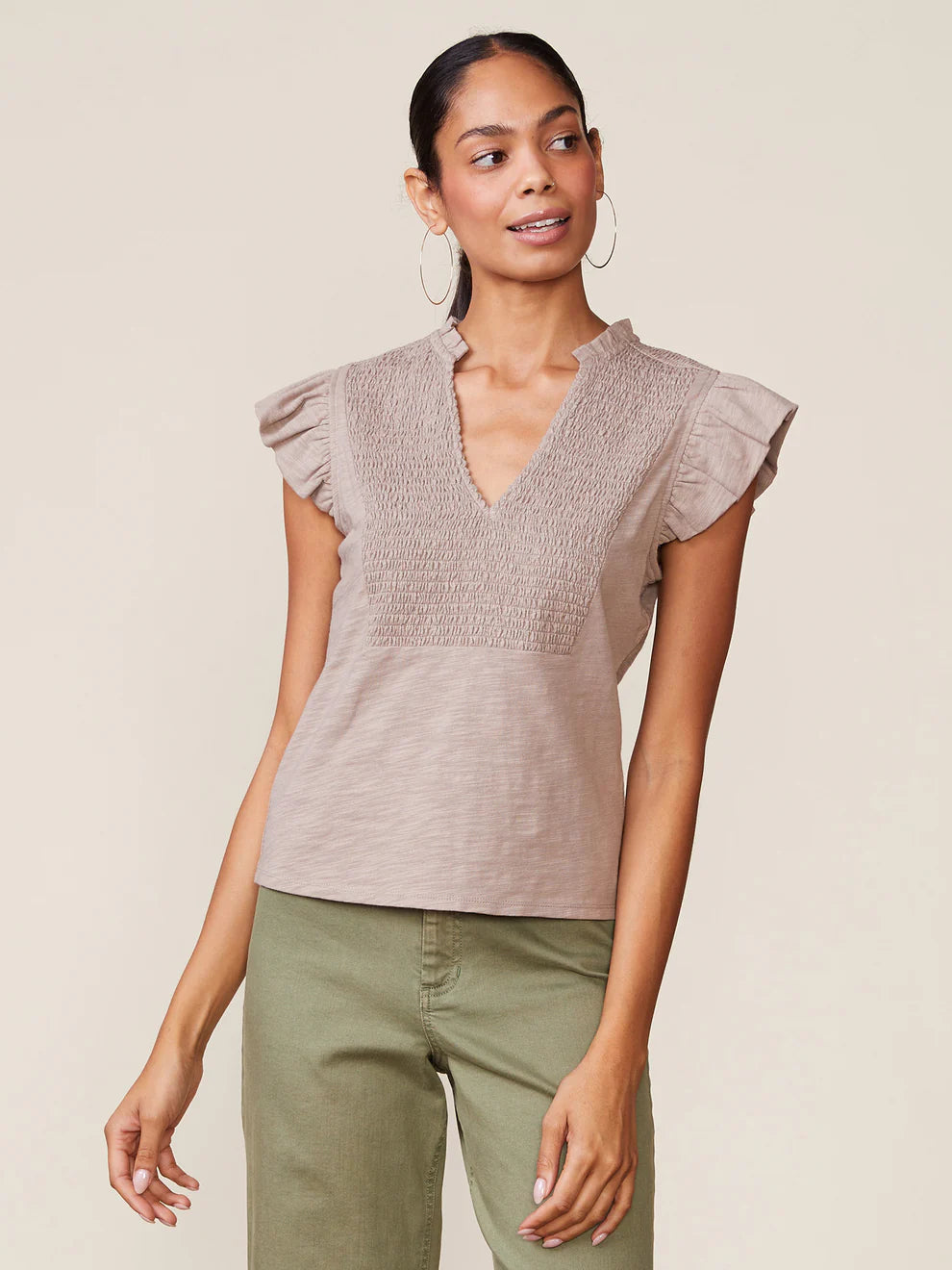 Anthem Flutter Sleeve Smocked Bib Slub Tee- Hazelnut