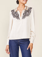 - Made in our smooth and silky sunset satin, this long sleeve blouse features a v-neckline and collar with a contrast color eyelash lace yoke. Dress up this closet staple with your favorite fitted skirt or play down the look with casual denim. The options are endless here!