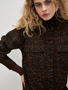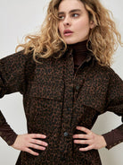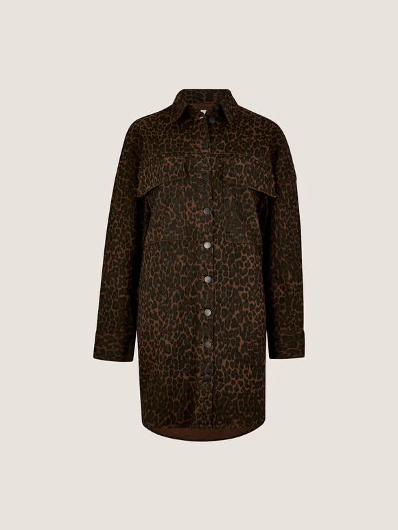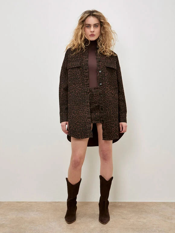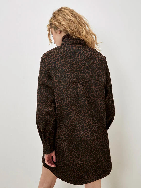Cool and casual, this denim mini dress is made for all your weekend plans. Framed by a collar and long sleeves, it boasts a bold leopard print, twin chest patch pockets, and a button-down front. Wear this shirt dress with bare legs and cowboy boots, or style it open, layered over a fitted top and teamed with the matching leopard print skirt.
