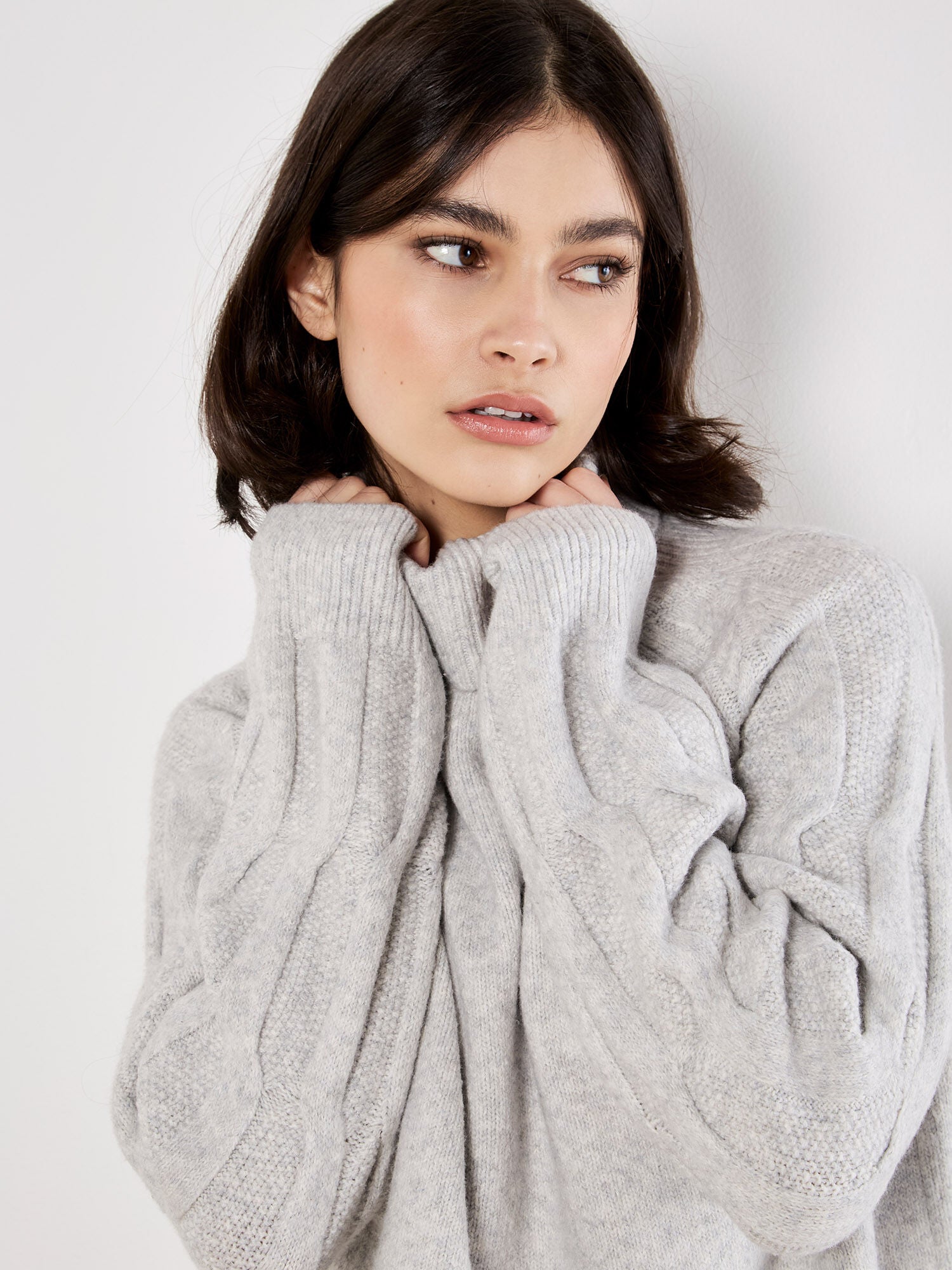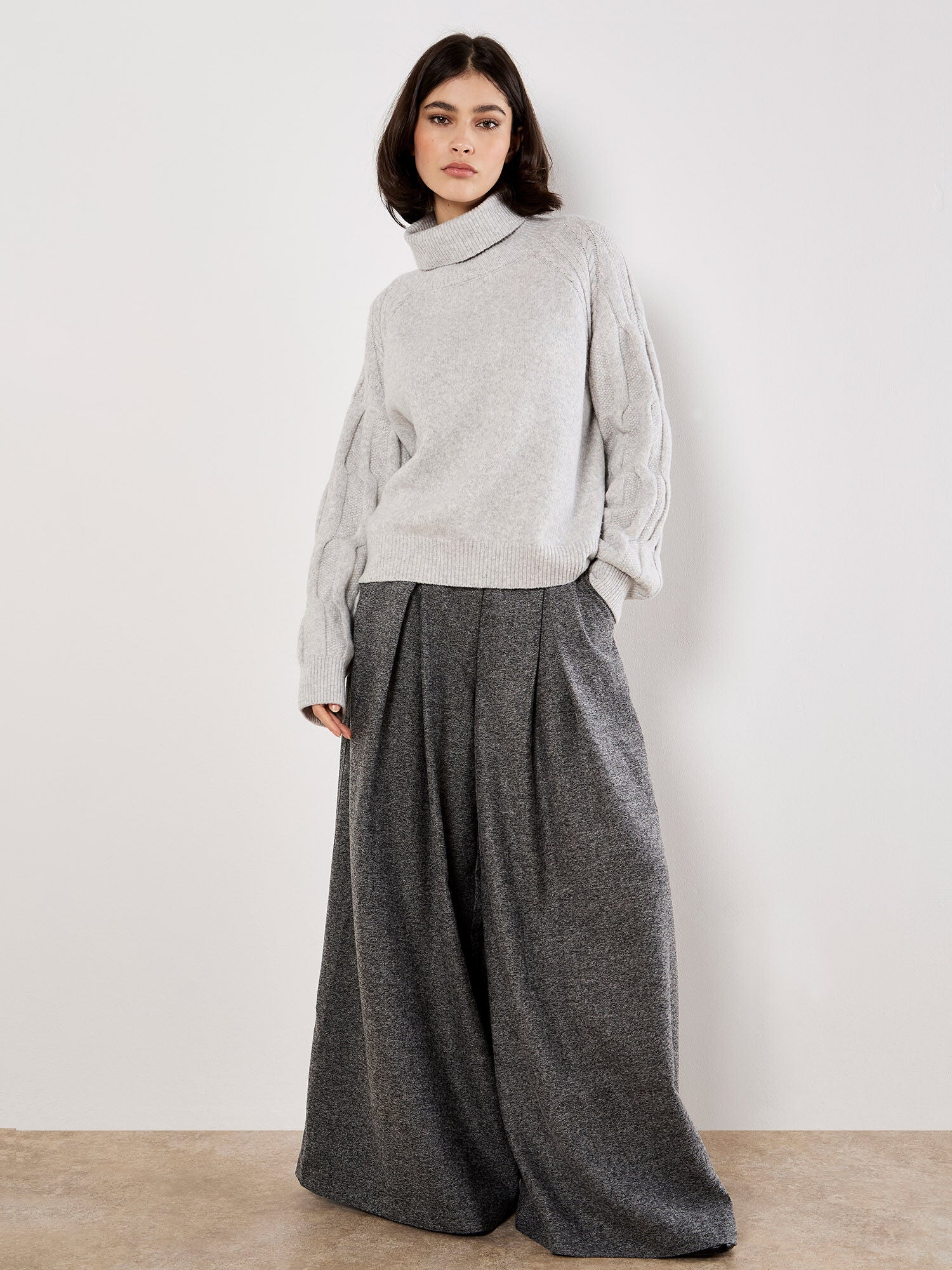 Apricot Melange Cable Knit Roll Neck Sweater- Grey