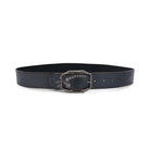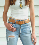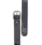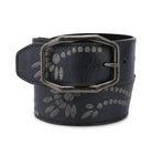 Mohawk is a women's distressed leather belt featuring intricately embroidered details with tonal stitching. The floral design will surely get noticed, along with the uniquely shaped metal buckle. Enjoy the Mohawk belt through belt loops or around your waist of your favorite maxi dress.