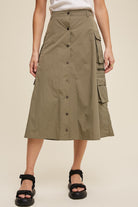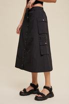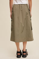 - Parachute cargo midi skirt - Elastic on back waist with belt loops - Button down - A-line - Two patch pockets on side seam - Finished with clean hem - Lined - Model is 5' 8" 30-24-35 and wearing a size Small