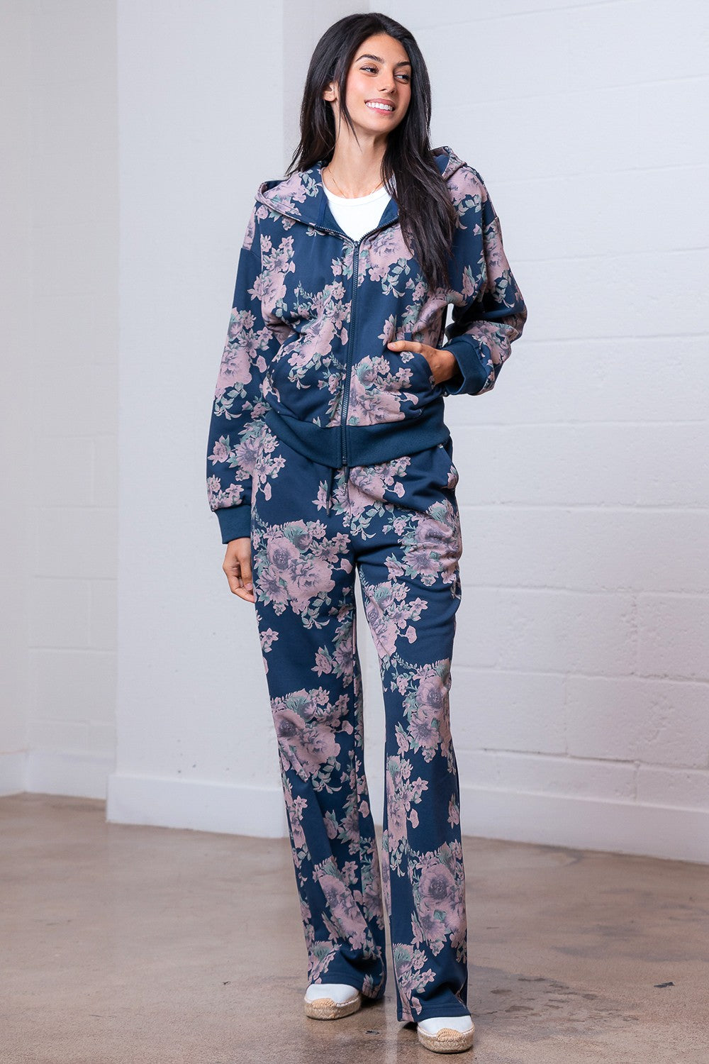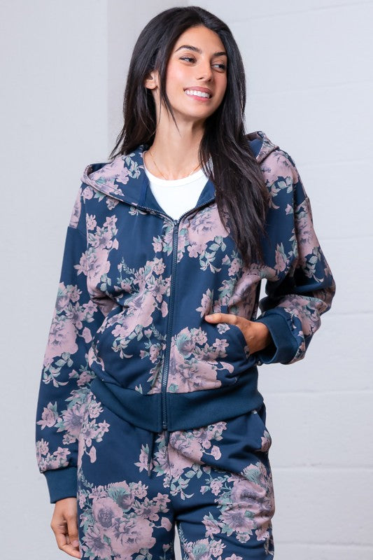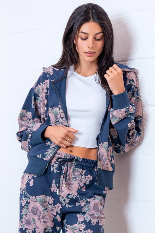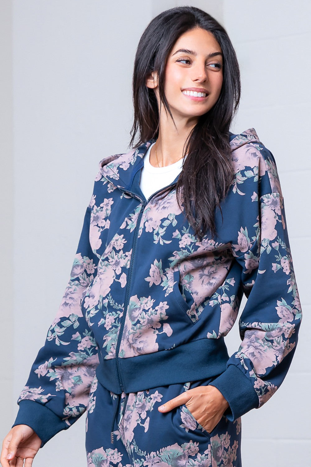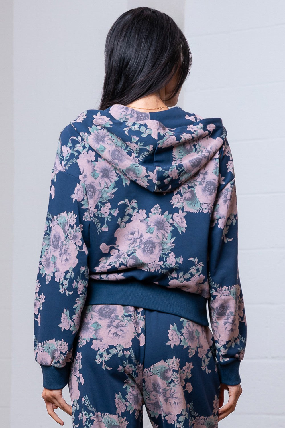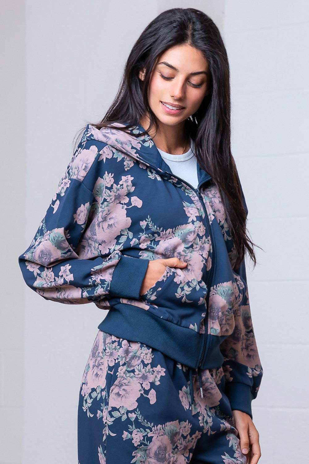 Taelynn Flower Printed Sweat Jersey Zip-Up Hoodie- Navy